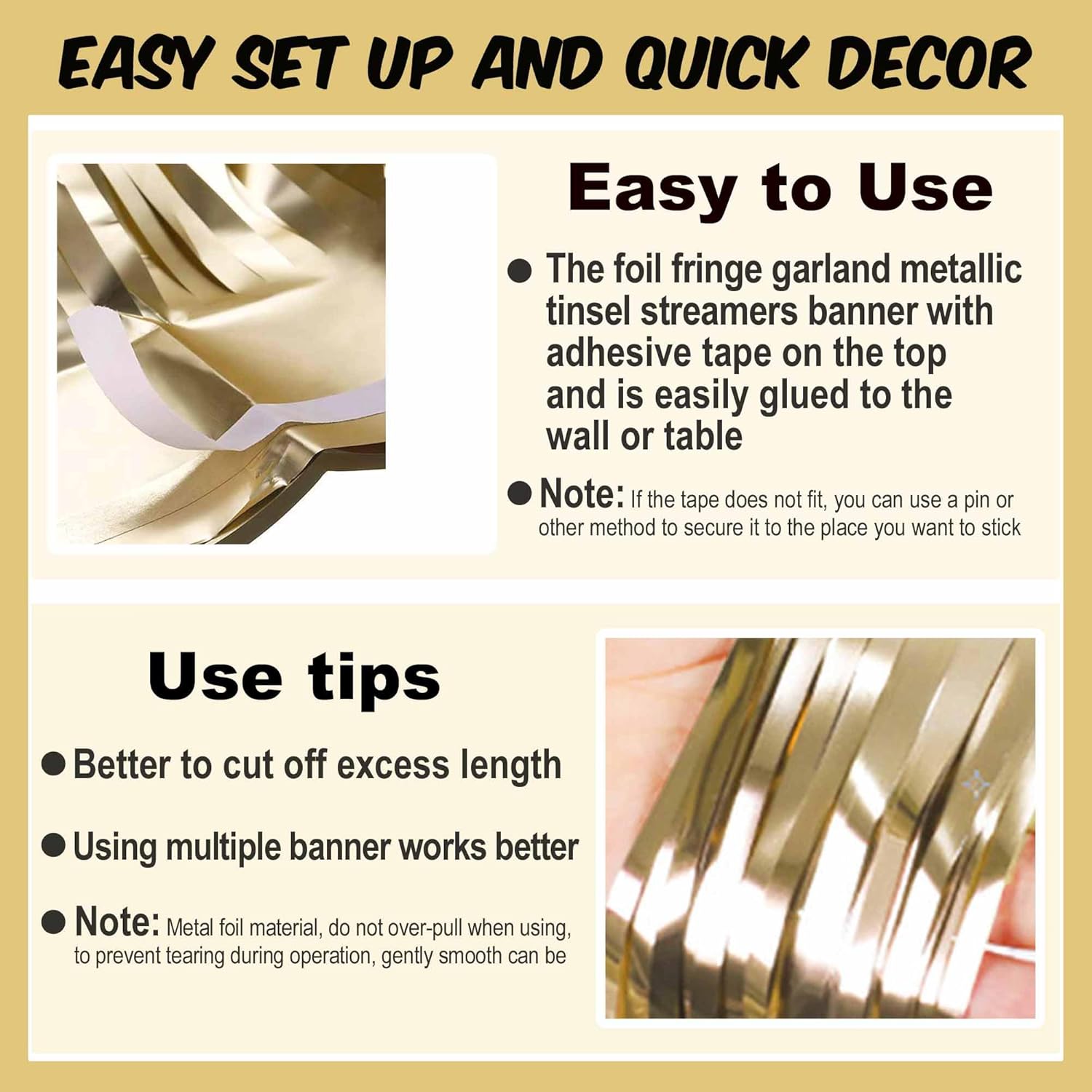- Easy to Use: Tinsel foil fringe garland banner streamers the back has double-sided tape, gently peel double-sided tape off and it would be very easy to paste on wall, window, table, door, parade float or anywhere you want to decorate, add some festive atmosphere to the party