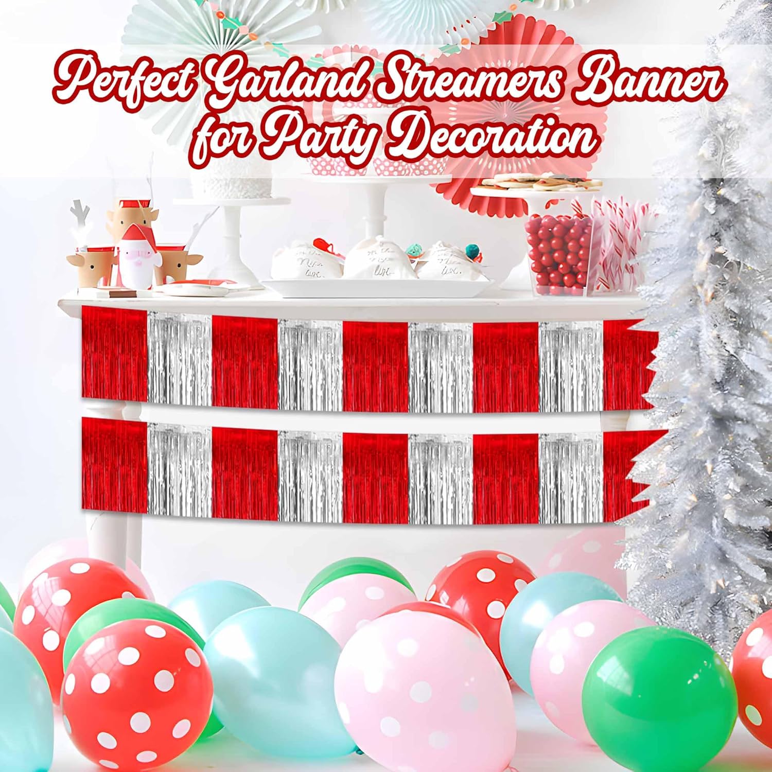4 Pack 10 Ft Red and Silver Foil Fringe Garland Metallic Streamers Tinsel Banner Wall Hanging Garland Backdrop for Parade Floats, Halloween, Christmas, Thanksgiving, New Year Party Decorations