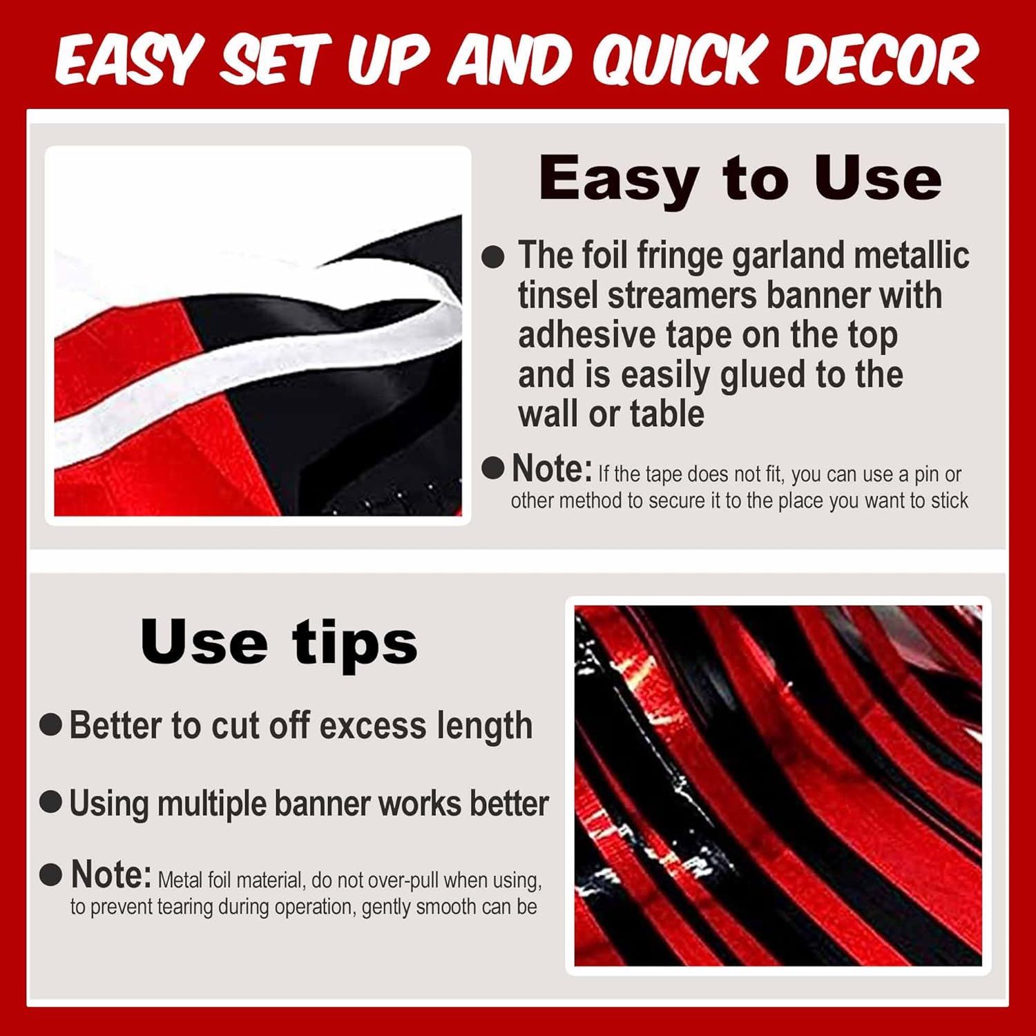 - Easy to Use: Tinsel foil fringe garland banner streamers the back has double-sided tape, gently peel double-sided tape off and it would be very easy to paste on wall, window, table, door, parade float or anywhere you want to decorate, add some festive atmosphere to the party