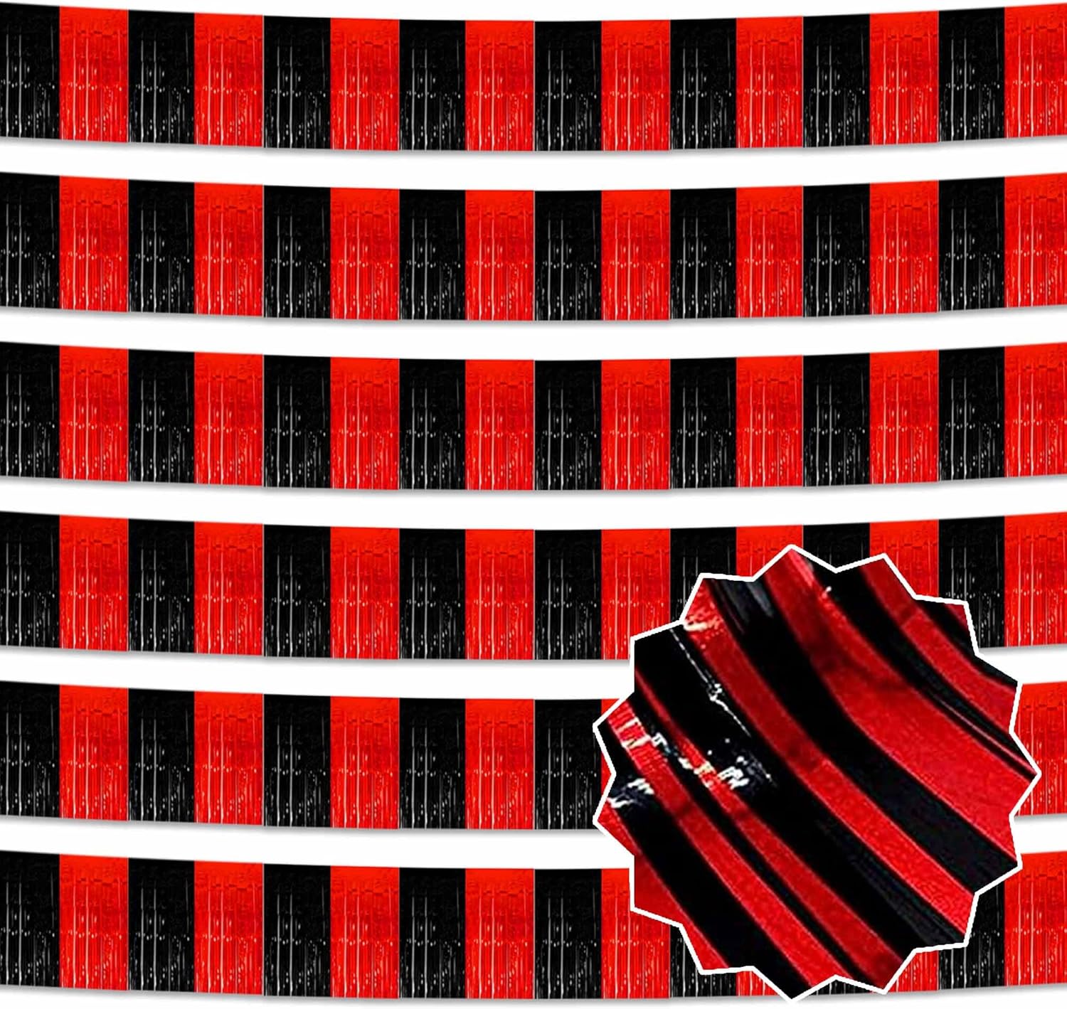 6 Pack 10 Ft Black and Red Foil Fringe Garland Metallic Streamers Tinsel Banner Wall Hanging Garland Backdrop for Parade Floats, Halloween, Christmas, Thanksgiving, New Year Party Decorations