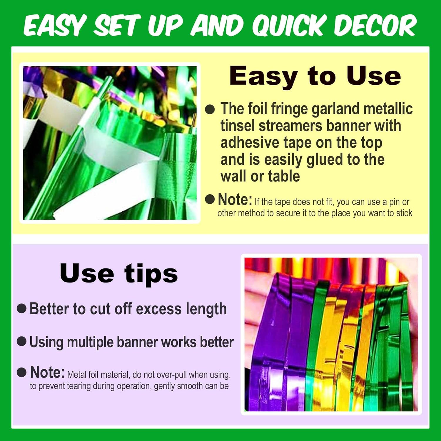 - Easy to Use: Tinsel foil fringe garland banner streamers the back has double-sided tape, gently peel double-sided tape off and it would be very easy to paste on wall, window, table, door, parade float or anywhere you want to decorate, add some festive atmosphere to the party