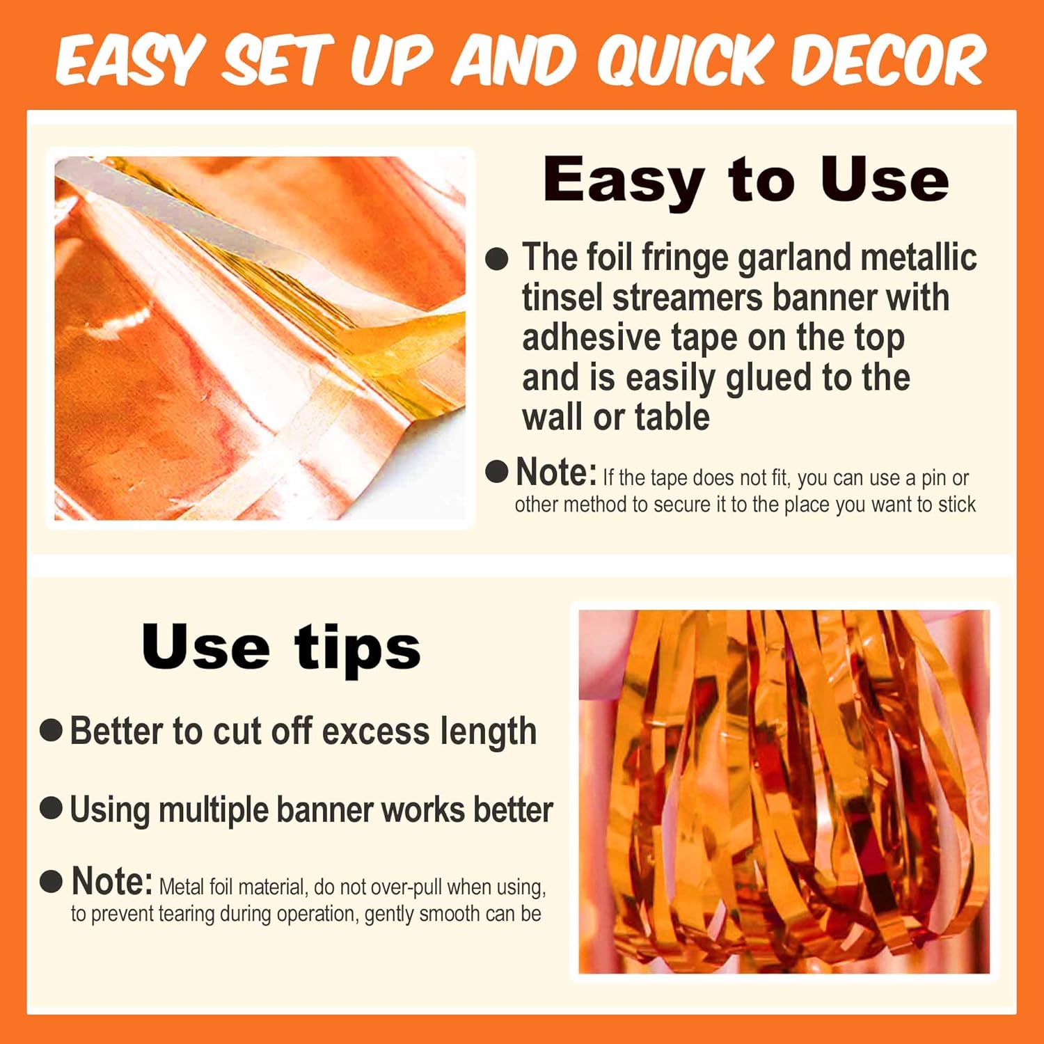 - Easy to Use: Tinsel foil fringe garland banner streamers the back has double-sided tape, gently peel double-sided tape off and it would be very easy to paste on wall, window, table, door, parade float or anywhere you want to decorate, add some festive atmosphere to the party