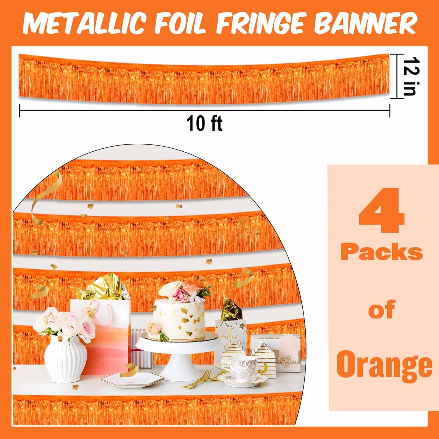 4 Pack 10 Ft Orange Foil Fringe Garland Metallic Streamers Tinsel Banner Wall Hanging Garland Backdrop for Parade Floats, Halloween, Christmas, Thanksgiving, New Year Party Decorations