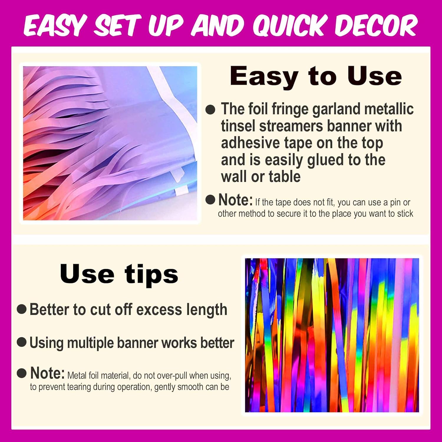 - Easy to Use: Tinsel foil fringe garland banner streamers the back has double-sided tape, gently peel double-sided tape off and it would be very easy to paste on wall, window, table, door, parade float or anywhere you want to decorate, add some festive atmosphere to the party