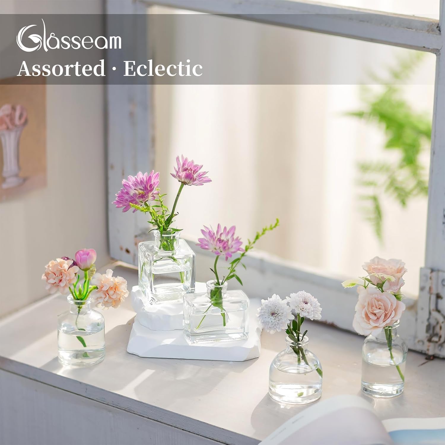 - Assorted Glass Bud Vase: These mini vases' varied shapes gives an eclectic feel and aslo adds a unique charm to any room; They are chic enough to appreciate on their own, and simultaneously highlight the unique beauty of your plants when paired with flowers