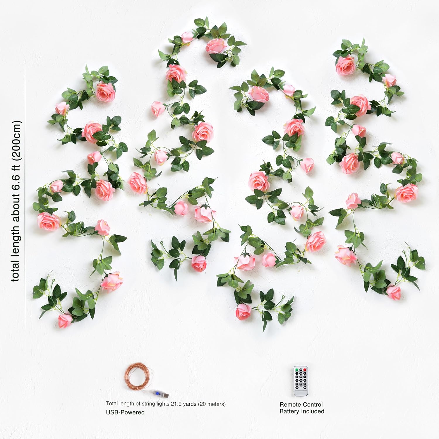 FiveSeasonStuff 29 Ft 4 Pack Amaranth Light Pink Rose Silk Flower Garland Artificial Flowers Decoration Hanging Floral with 66 feet String Lights