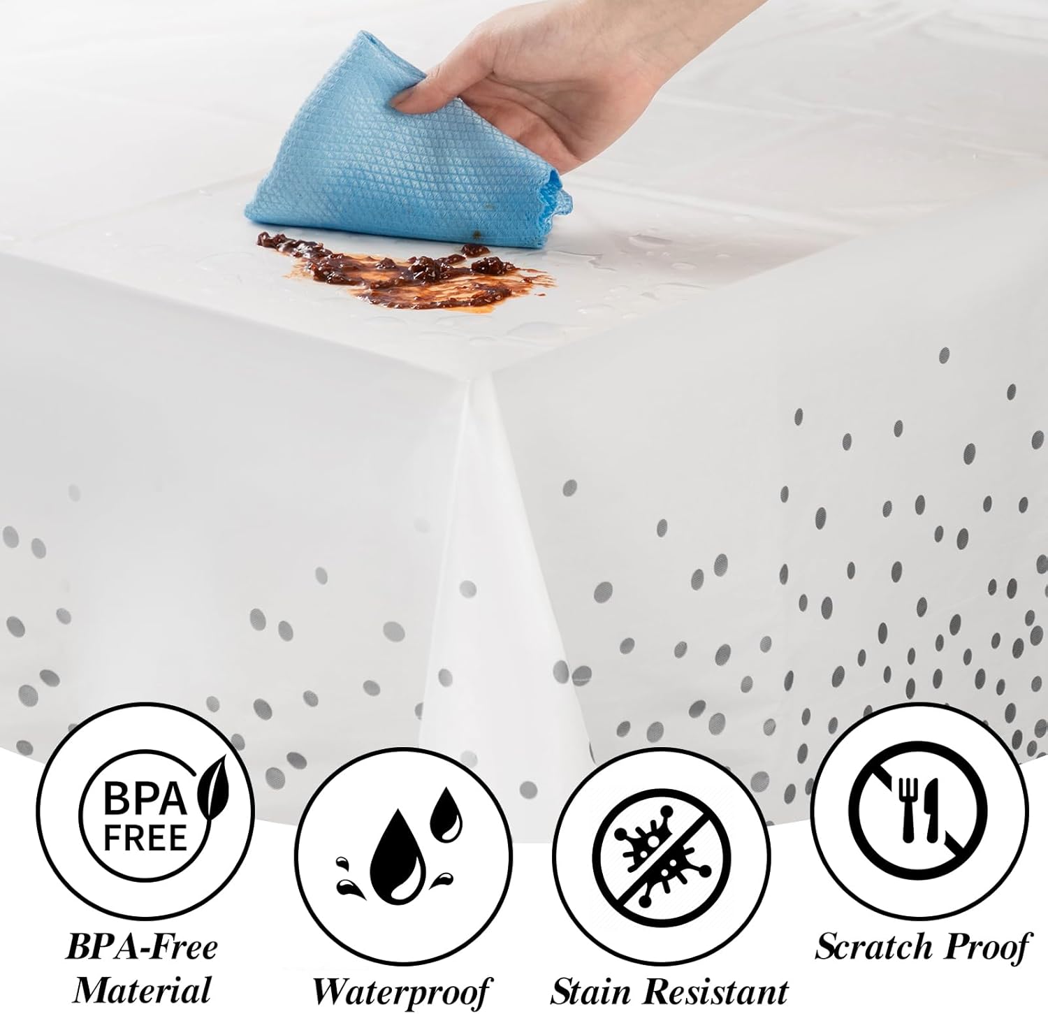 - EASY TO USE - Disposable plates, cutlery, and tablecloth can be tossed in the trash without the need for cleaning after use, saving time and allowing you to have a great party time with your guests. The heavy-duty white tablecloths with silver dots are waterproof, stain-resistant, and scratch-resistant.