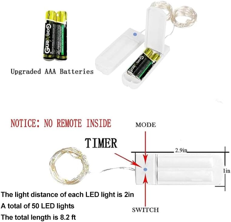 - 【4 Pack Ultra-Bright LED Battery Powered Fairy Lights】4 packs of 50LED lights with a total wire length of 8.2 feet. Each fairy lights is composed of 50 super bright LED bulbs, each bulb spacing of 2 inches, emit 2700k green light, bring a romantic atmosphere to your bedroom, garden, its battery box size of 2.95*0.9 inches;
