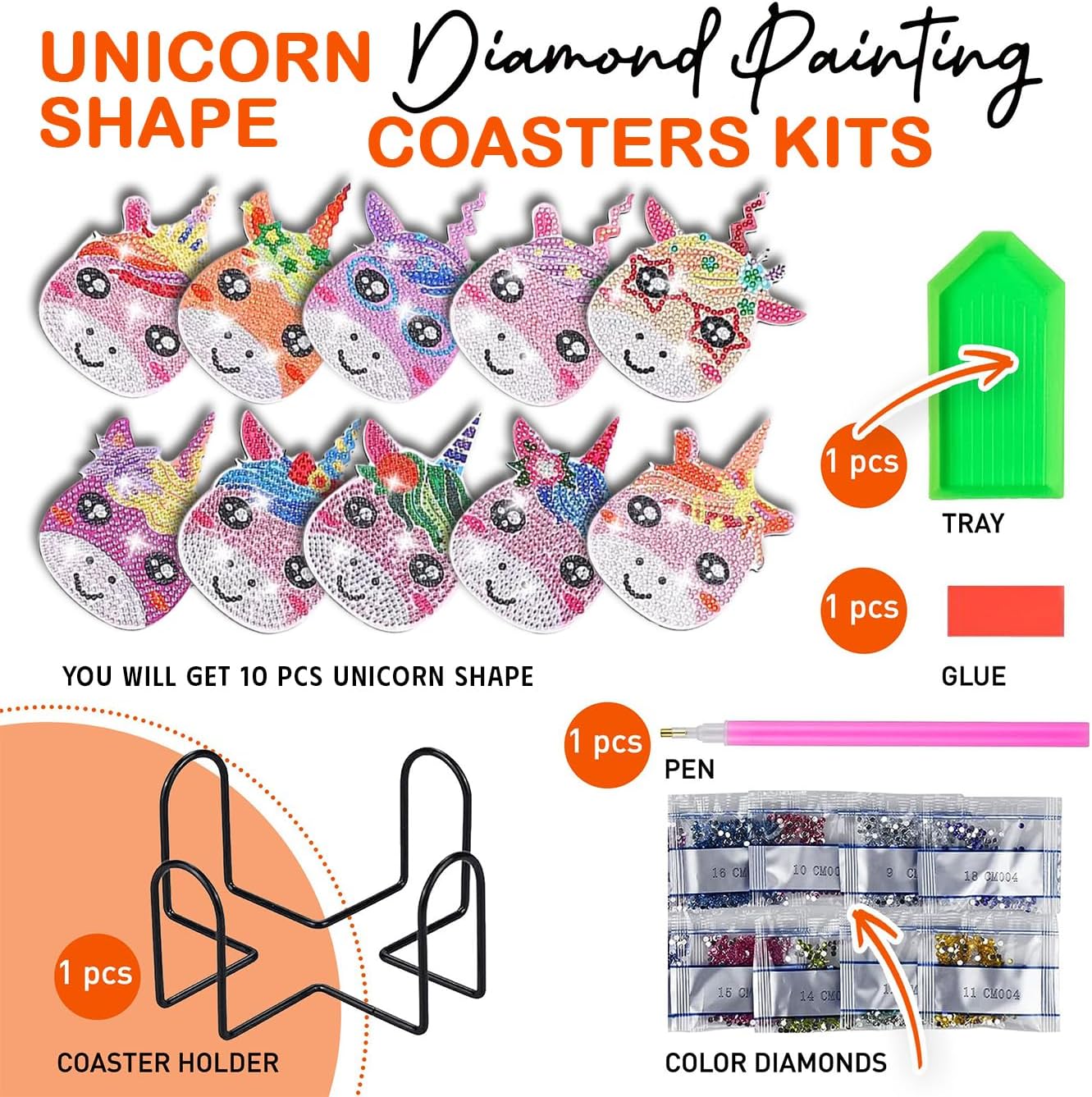 - Unicorn Coaster Set: You will receive 10 cute Unicorn diamond art coasters with 1 holder, a variety of colorful diamond drills, adhesive, clay, and pen, providing ample quantity and various designs to easily meet your dessert serving needs with this adult craft kits.