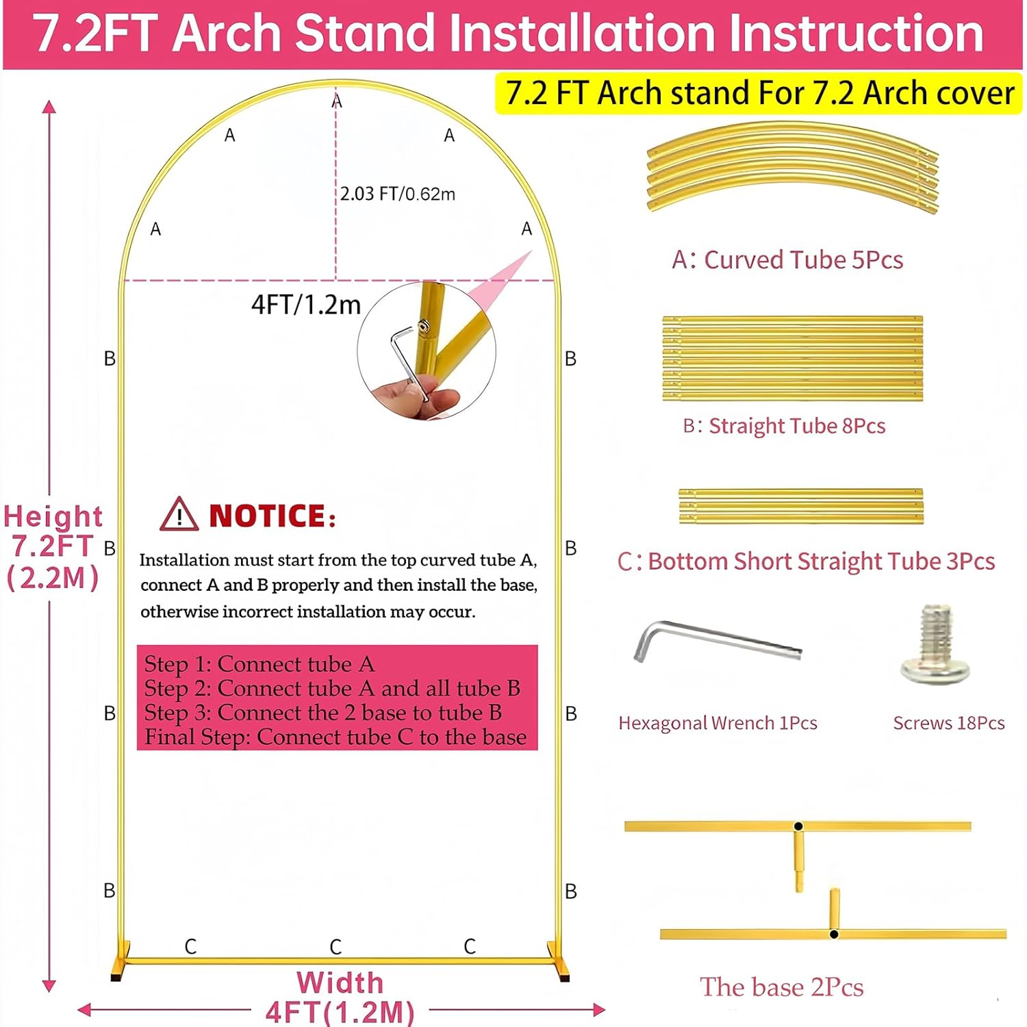 - Note:7.2FT Arch Stand for 7.2FT Arch cover. Installation must start from the top curved tube,connect curved tube and Straight tube properly and then install the base,otherwise incorrect installation may occur