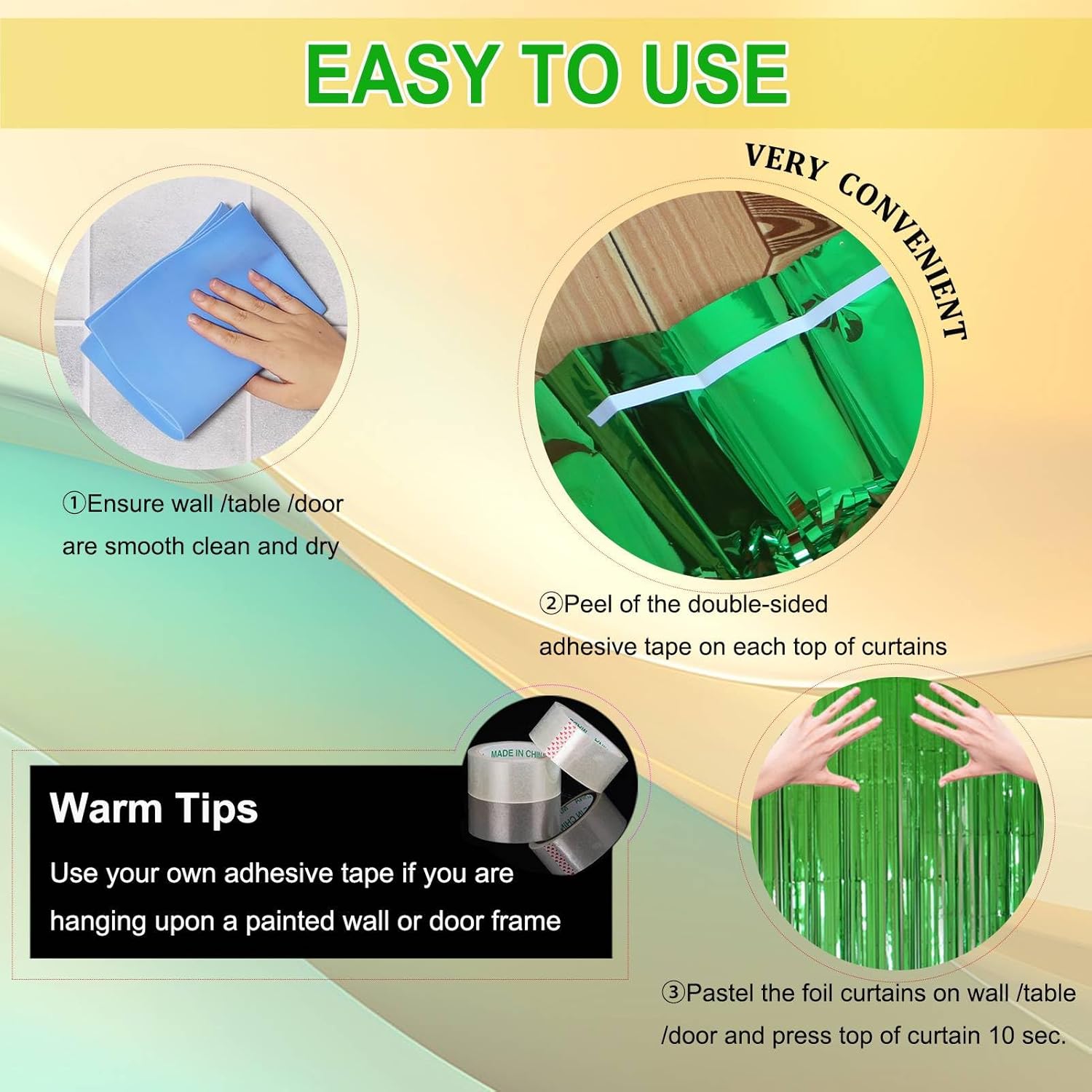 - EASY TO USE TINSEL BACKDROP: These foil fringe curtains are easy to install with only two steps - tear off the back of the double-sided adhesive tape and paste the foil curtain on the wall/door/table to decorate your Green and Gold party