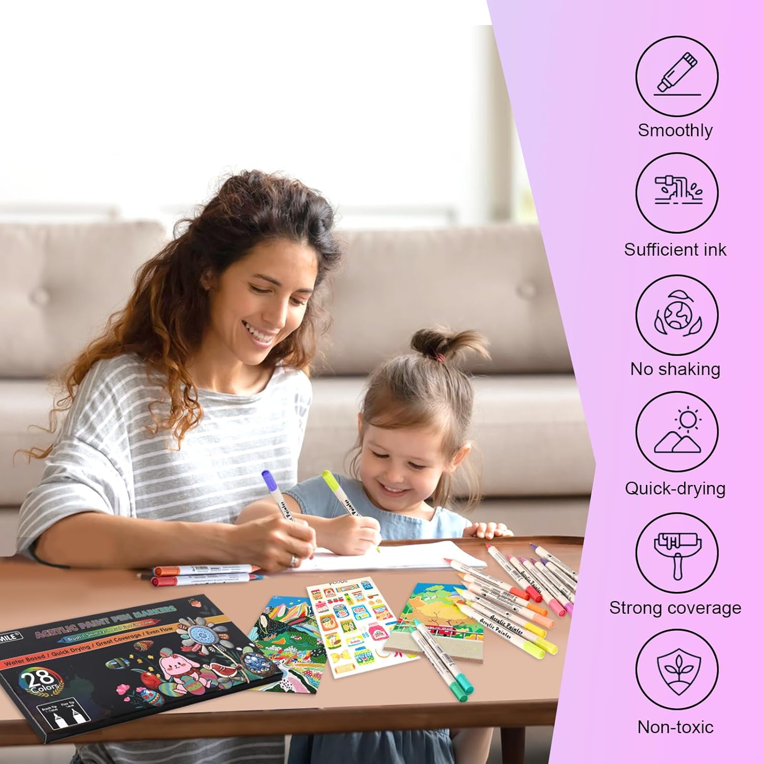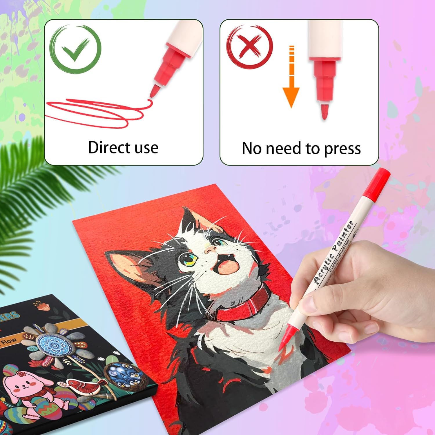 - 【Convenient to Use】Our paint pens with new design.You don't need to shake or press when using it,open the pen cap and you can start your creative journey.our acrylic pens are cotton nibs that it can be used directly.Warm tip:To ensure the smoothness of the ink, please place the pen flat and cover it with a pen cap after use.