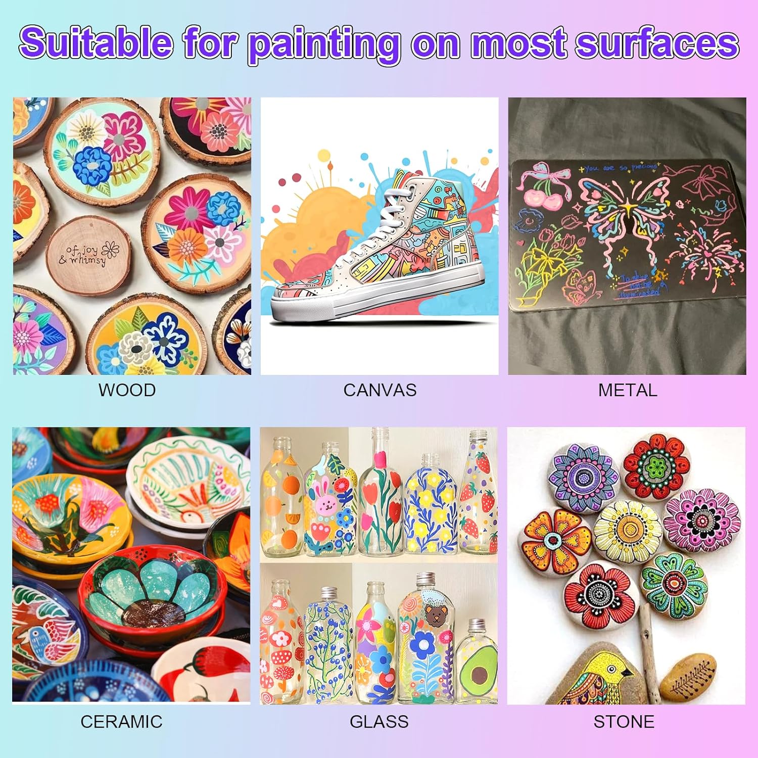 - 【Widely Used】Acrylic paint pens have the characteristics of strong coverage,quick drying,and smoothness, making them suitable for various surfaces.such as canvas,wood,metal, rock painting,glasses,plastic,paper,ceramics,and more.