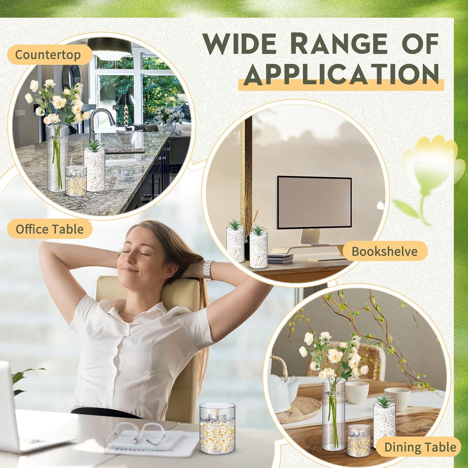 - Transparent Cylinder Design: the clear and transparent design of these wide vases allows for a beautiful and unobstructed view of the contents within, enhancing the visual appeal of your floral arrangements or candle displays; The sleek cylindrical shape adds a modern touch to any setting, making it an ideal choice for both casual and formal occasions