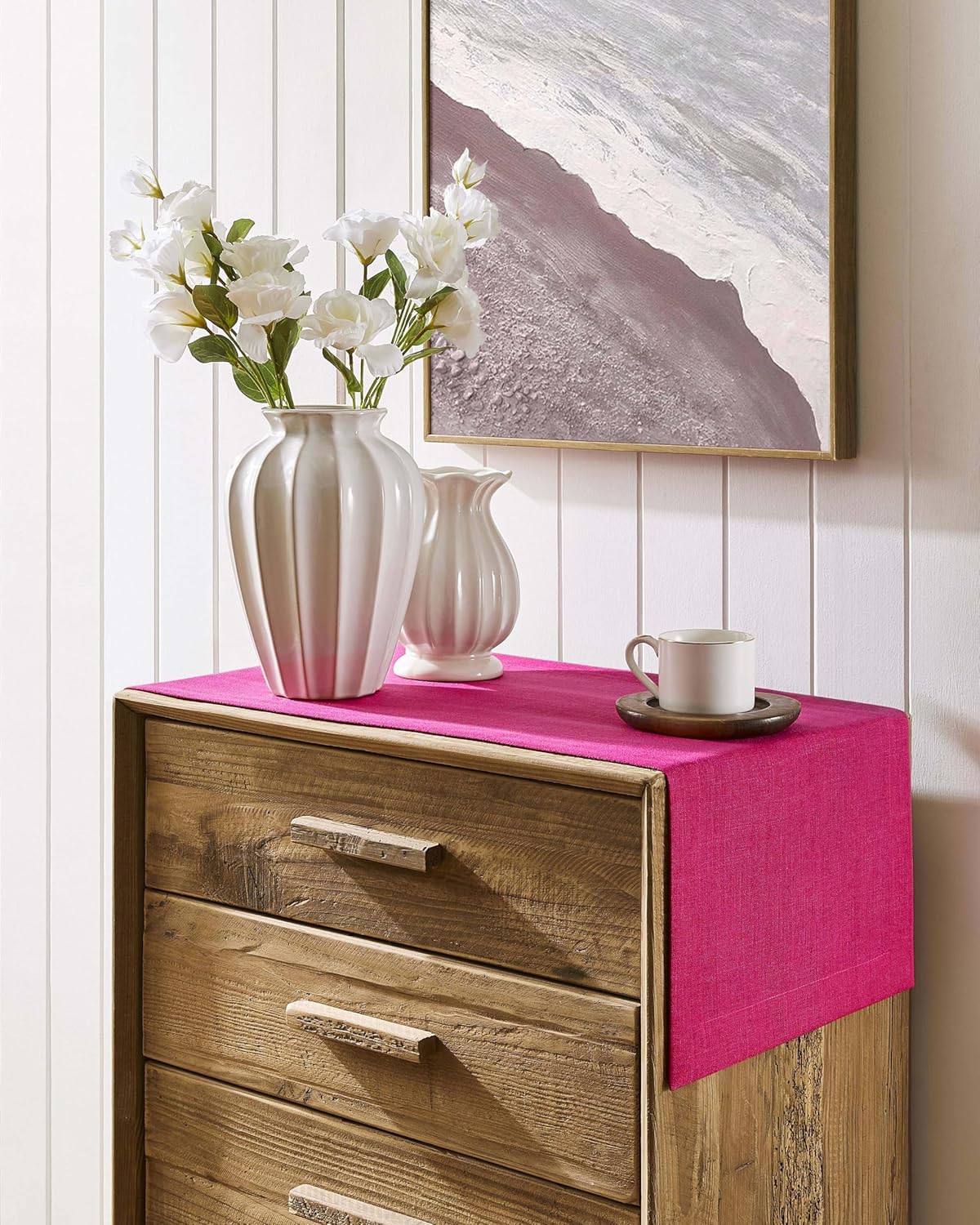 ZeeMart Linen Textured Border Table Runner, 14 x 48 Inch Hot Pink, Farmhouse Style Pink Table Runners 48 Inches Long, Easy Care Everyday Polyester Table Runner