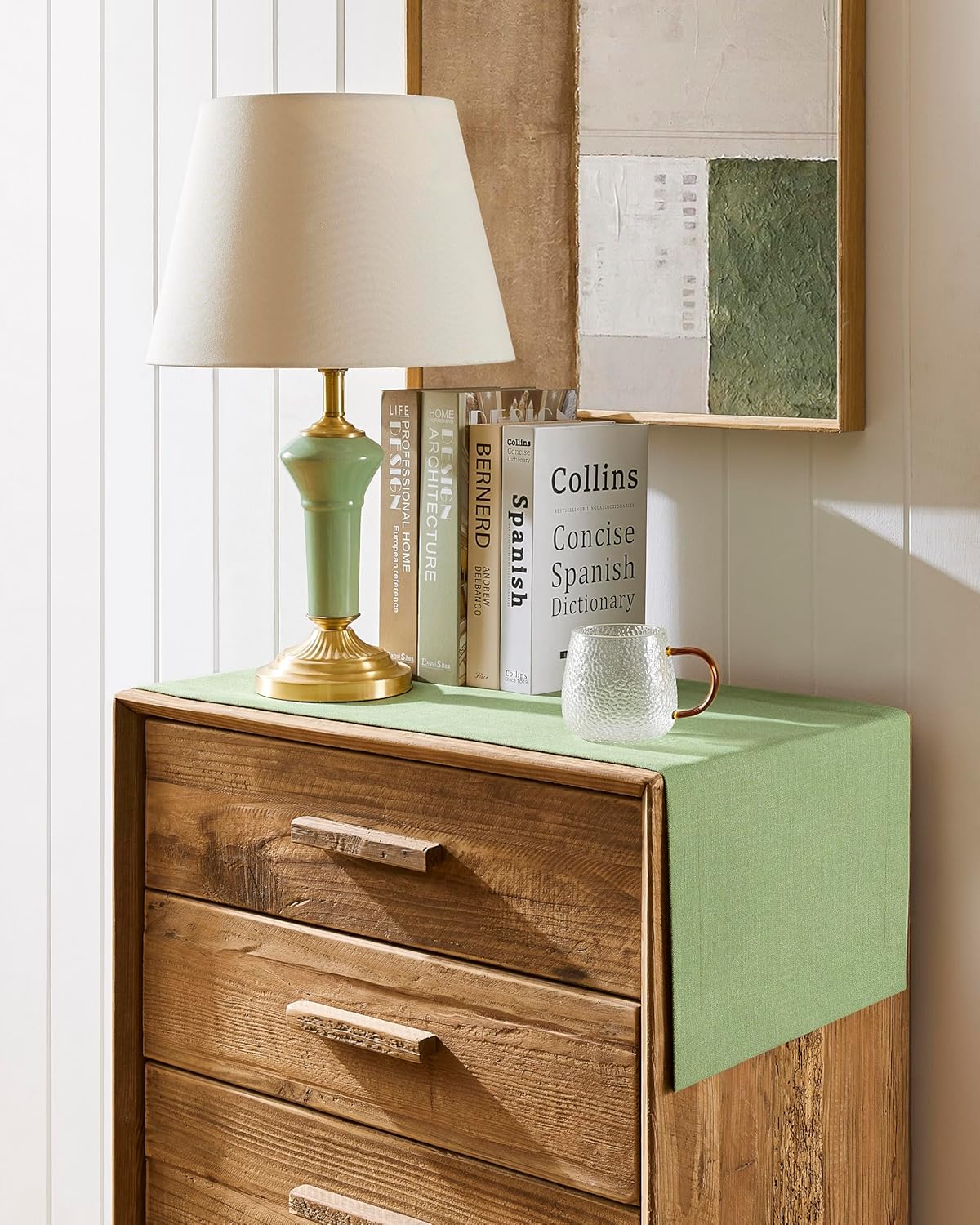 ZeeMart Linen Textured Border Table Runner, 14 x 60 Inch Green, Farmhouse Style Sage Green Table Runners 60 Inches Long, Easy Care Everyday Polyester Table Runner