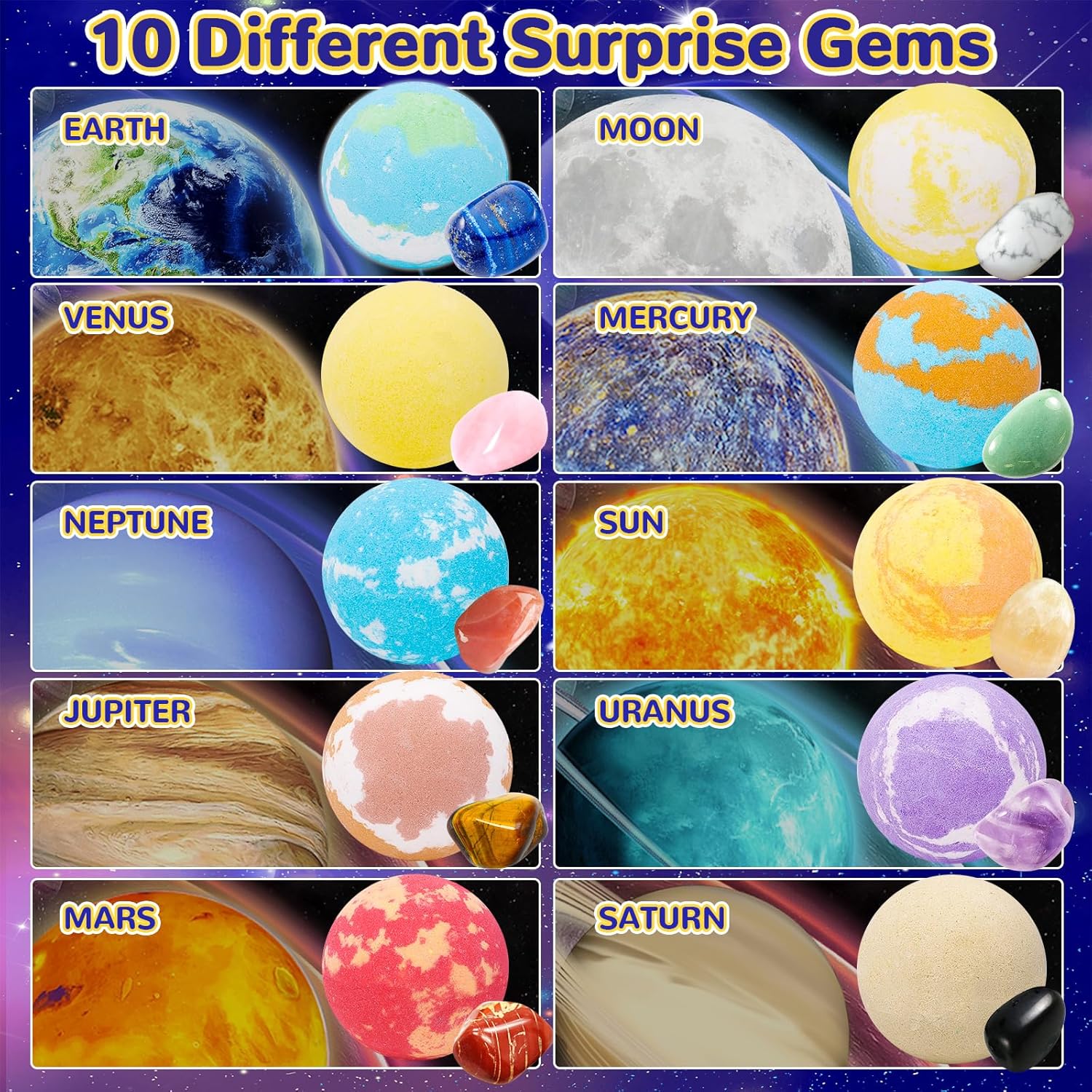 - Kids Bath Bombs with Surprise Inside - Package includes 10 different planet bath bombs with gemstones inside, 1 necklace ropes, 1 jewelry fastenings, 1 keychain, 10 education gem information cards, 1 storage bag and 1 magnifiers. Have a space adventure in the bath with our space themed bath bomb set that resemble planets and have a spaced themed toy inside.