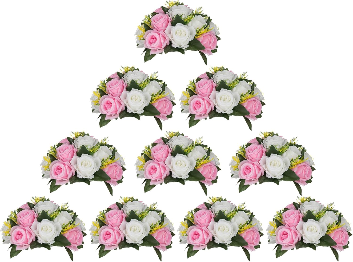 BLOSMON Flower Balls Rose Centerpieces: 10 Pcs Pink White Fake Flowers Kissing Balls Decor Artificial Wedding Floral Arrangements Silk Flower Bouquet with Base Home Party Room Table DIY Decorations