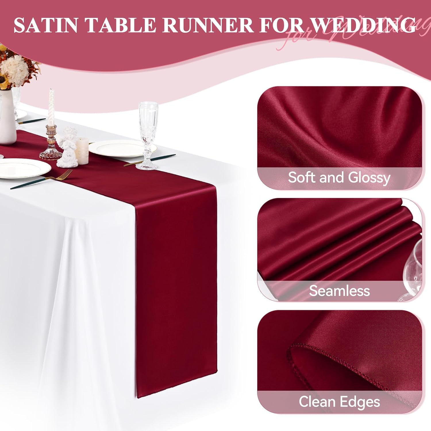 - đ·ăSet includesă20 Pack burgundy satin table runner measures 12" x 108" in size, appropriate for a table that can seat 8-10 people. This satin table runner can fit a 6ft/8ft rectangular table or round table well.This satin table runner is great for event table decorations.Our satin table runner make your dining table more dazzling and outstanding.Purchase our 20 piece satin table runner and save even more.