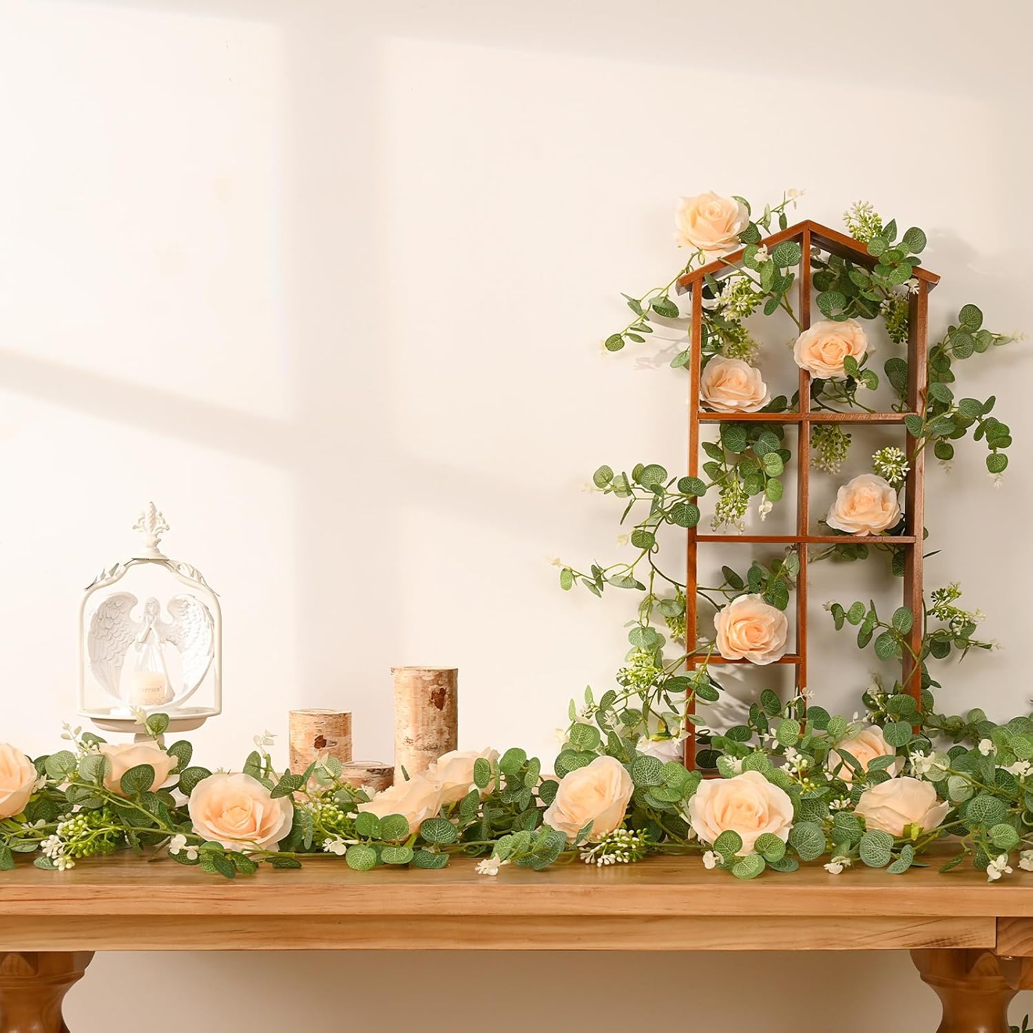 - 🌹PACKAGE INCLUDES: The package includes 2 Pcs artificial eucalyptus garland with flowers. Each piece of flower vine is 6.5Ft/2M long and decorated with 8 champagne roses, eucalyptus leaves and seeds. There are also many small plastic rings distributed on the vine for easy hanging. You can easily trim or bend the shape according to your own preferences and decorative needs.