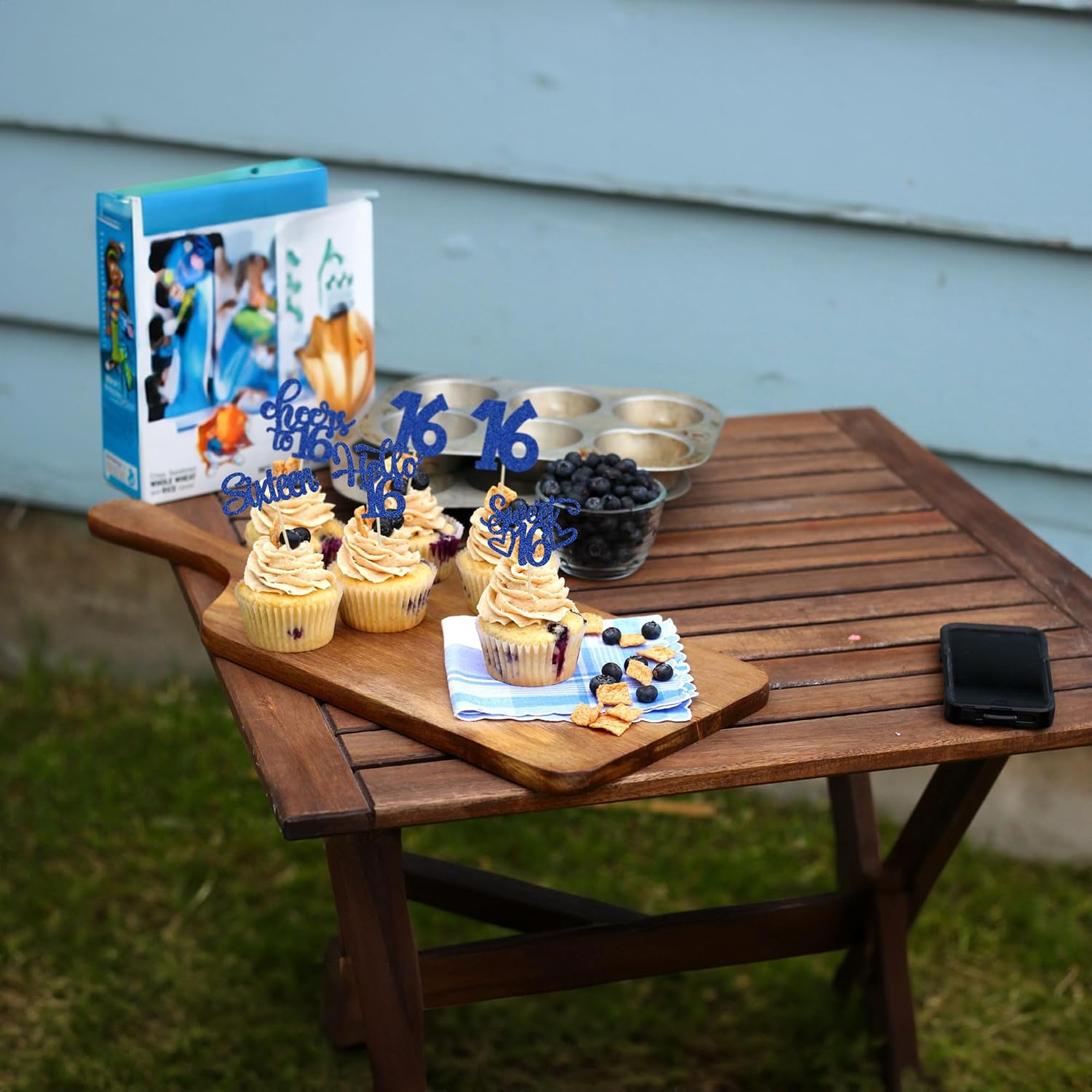 30pcs 16th Birthday Cupcake Toppers - Sixteen Happy 16th Cupcake Picks - Cheers to Sweet 16 Cake Decorations - Deep Blue Glitter
