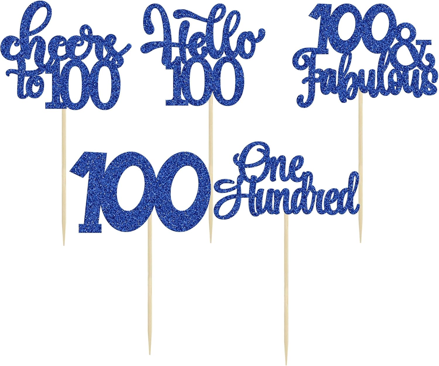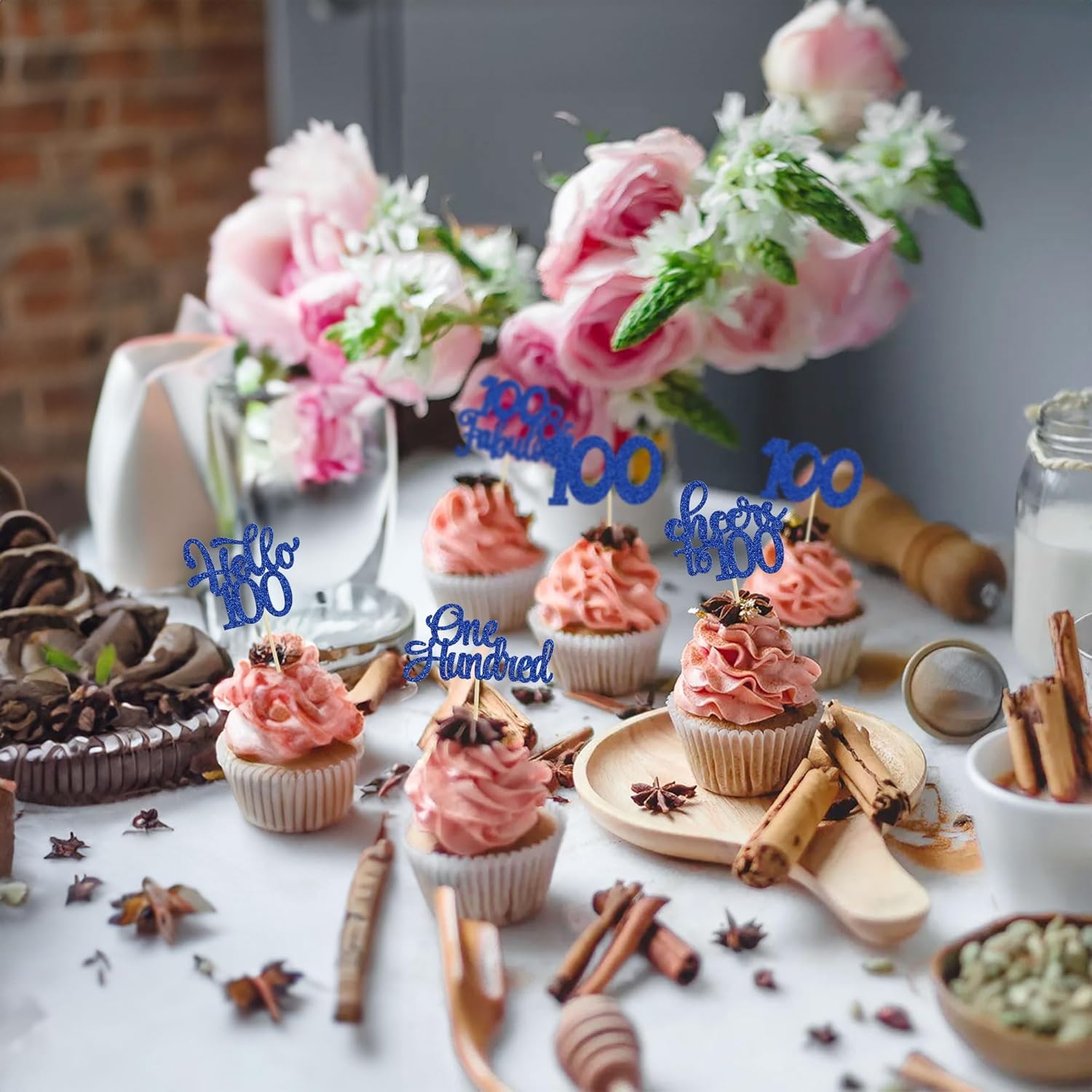 30pcs Happy 100th Birthday Cupcake Toppers - Deep Blue Glitter One Hundred Cheers to 100 Years Old Cupcake Picks for Anniversary Party Cake Decorations