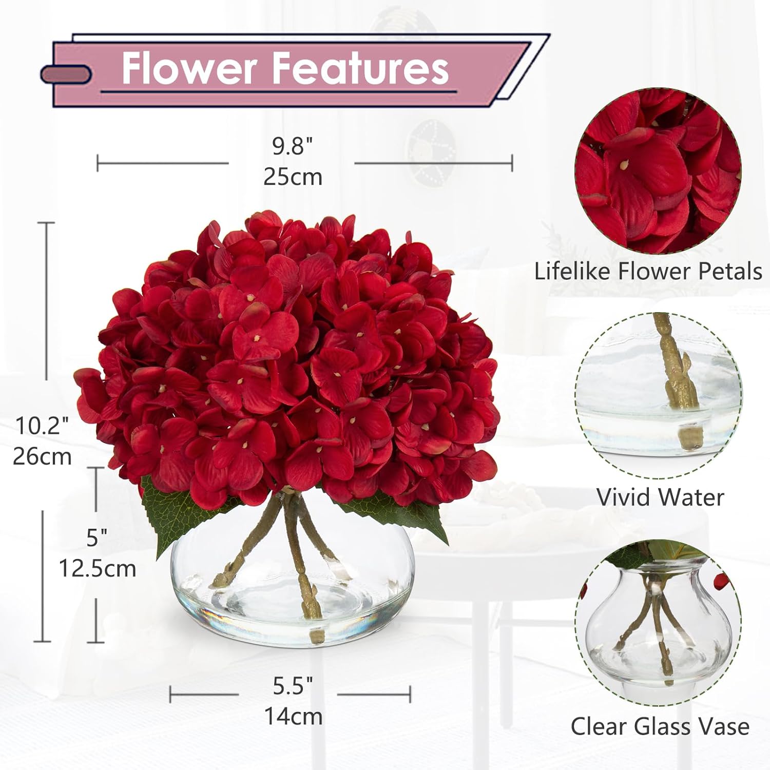 - 💐【Realistic & Elegant】Artificial hydrangea flowers in glass vase suits look so beautiful, unique craft design, brings different visual enjoyment to your home, create a romantic atmosphere, make you happy every day. Faux water on the vase adds to the pulchritude and realism. More realistic because of the details!