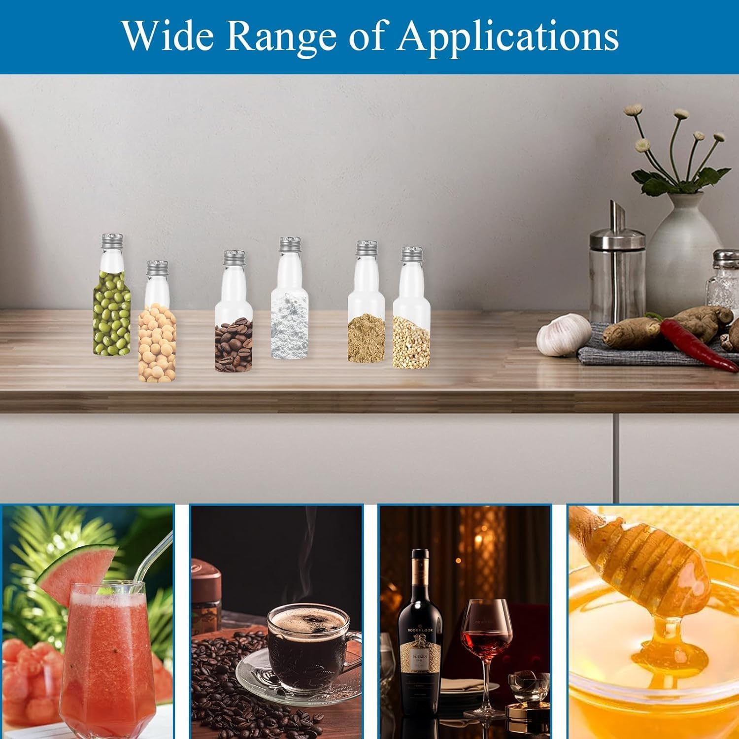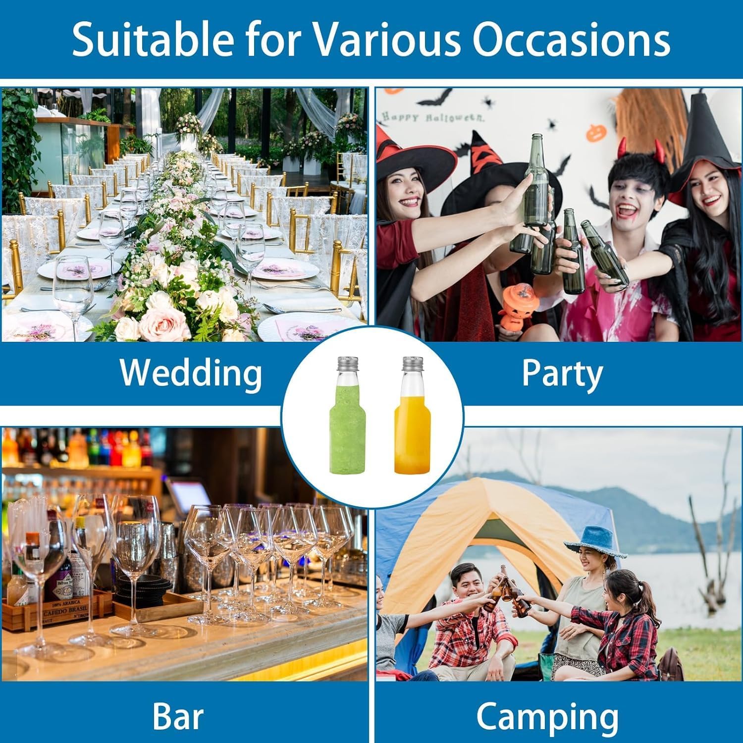 - 【Wide Application】Mini liquor bottles can store wine, wine, whiskey, essential oils, lotions, juices, condiments like hot sauce and vanilla extract as well as glitter, sand, mini beads, powdered paints and more. Mini champagne bottles are suitable for various occasions: weddings, parties, hotels, homes, restaurants, canteens, etc.