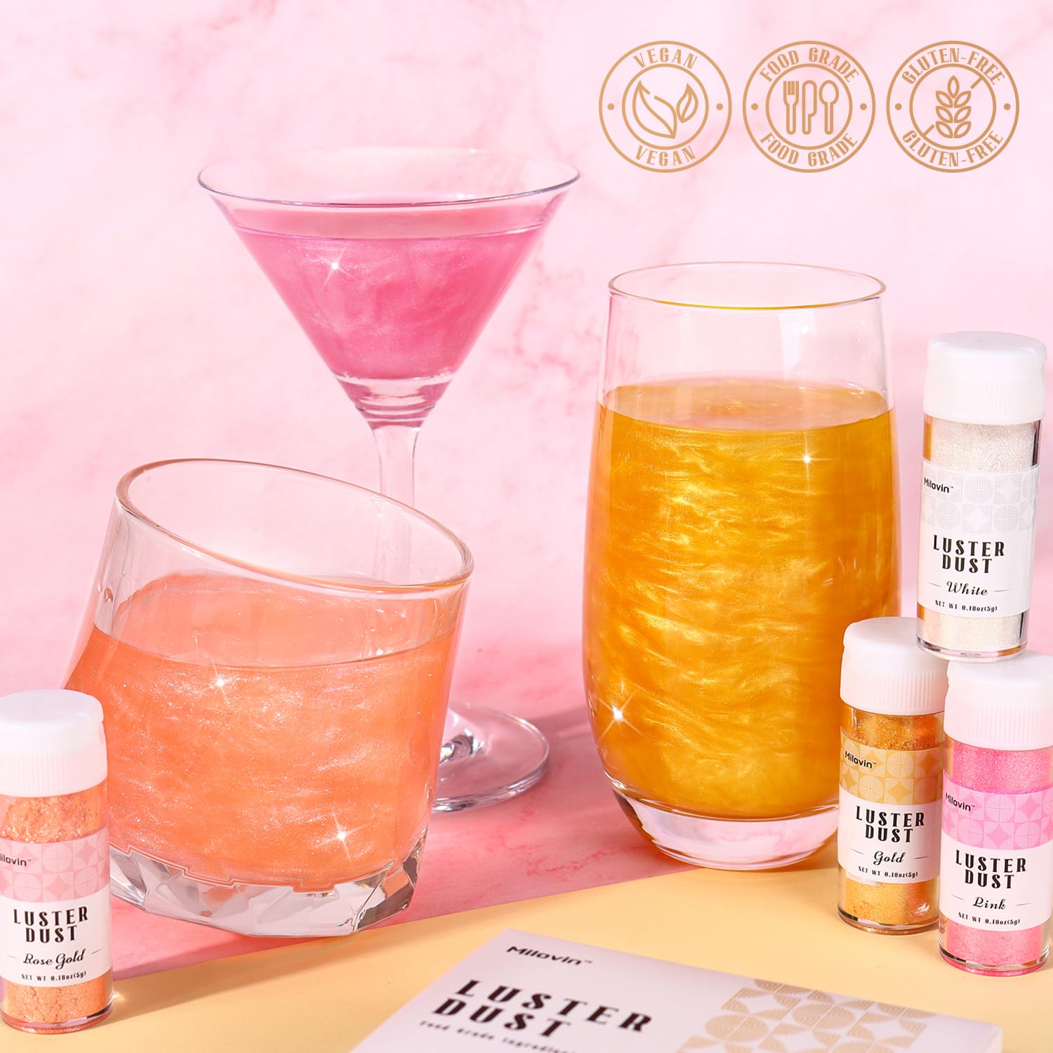 - Edible Glitter for Cocktails: Including gold edible glitter, rose gold glitter, white edible glitter, and pink edible glitter. Made of food-grade mica powder and food coloring. Odorless, Tasteless, Vegan, nut-free, gluten-free