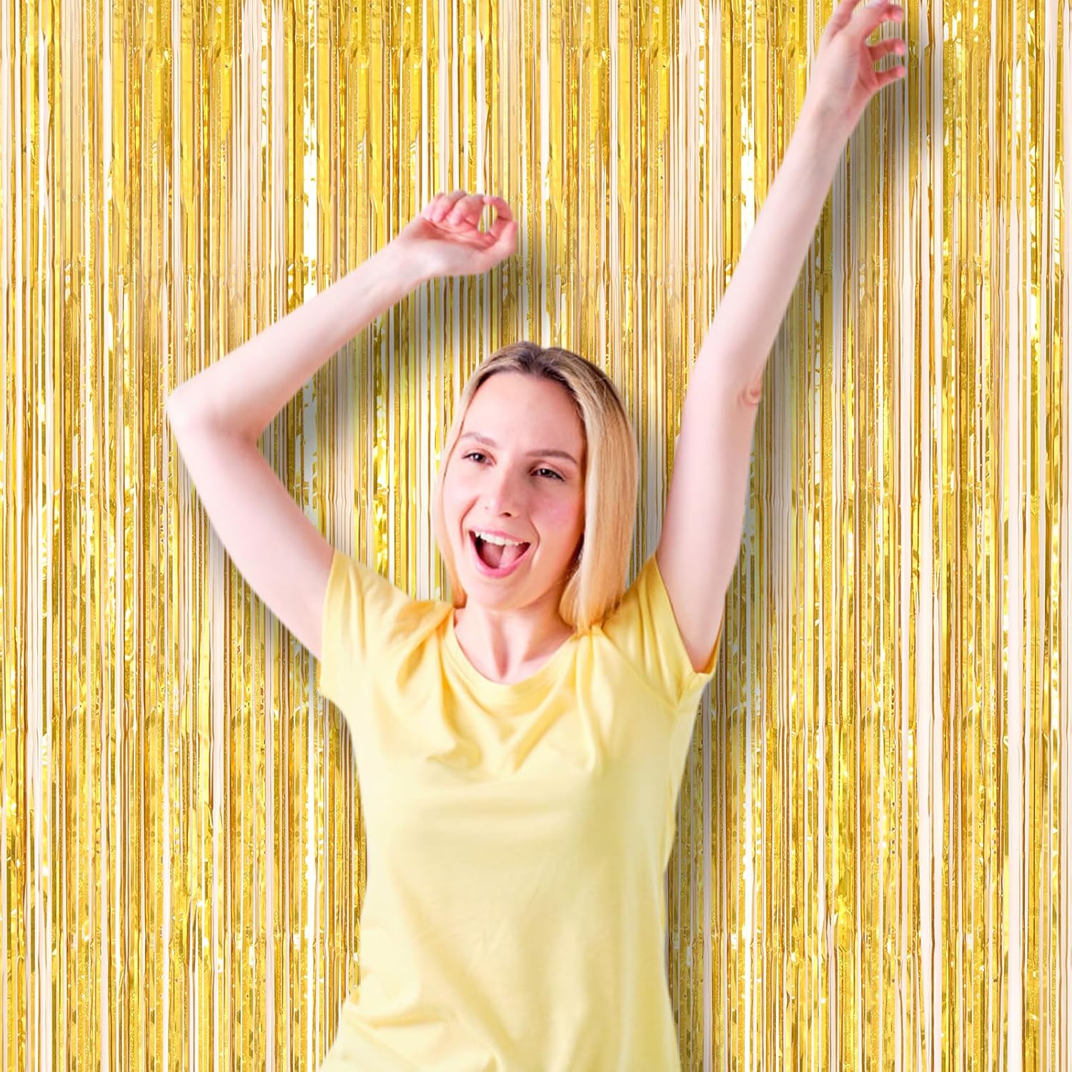 - Premium Material: This Laser Gold foil curtain backdrop is made of stable tinsel, non-fading, stay shiny and reusable. Unfold it and then enjoy your glittering party