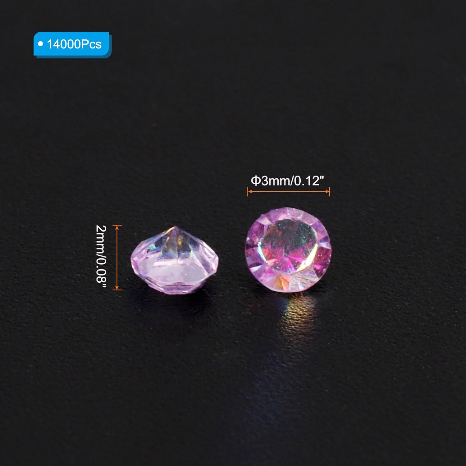 - Color: Light Purple AB; Material: Acrylic; Size: 3mm x 2mm/ 0.12 x 0.08 inch (Dia.x H); Packing List: 14000Pcs x Acrylic crystal diamonds