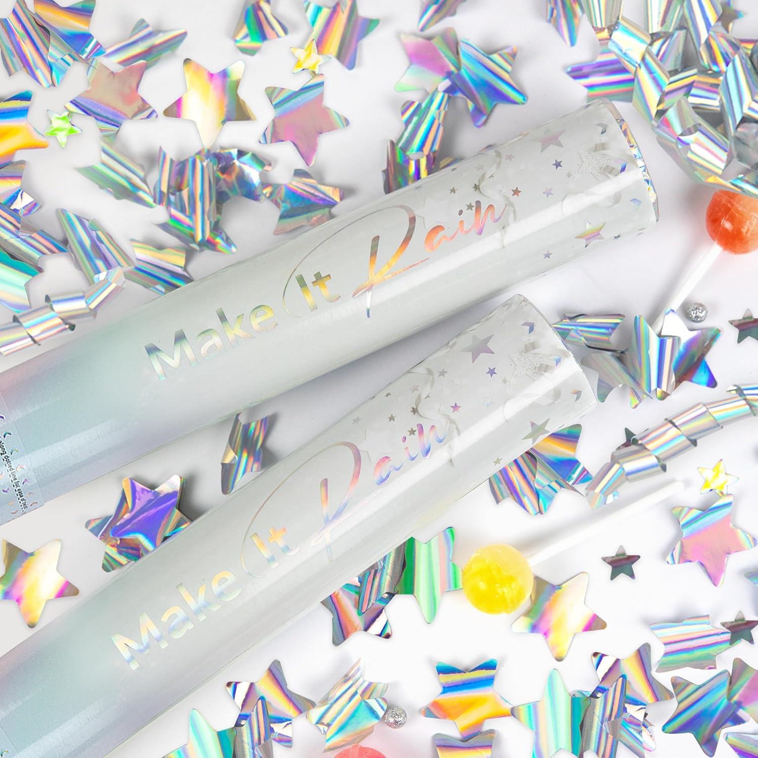 PrimePure Confetti Cannon Party Poppers - Holographic Silver Stars Confetti Popper - 2 Pack - Easy-to-Use Party Cannon - Silver Glitter Star Pop Gun for Graduation, Wedding, Birthday, Prank