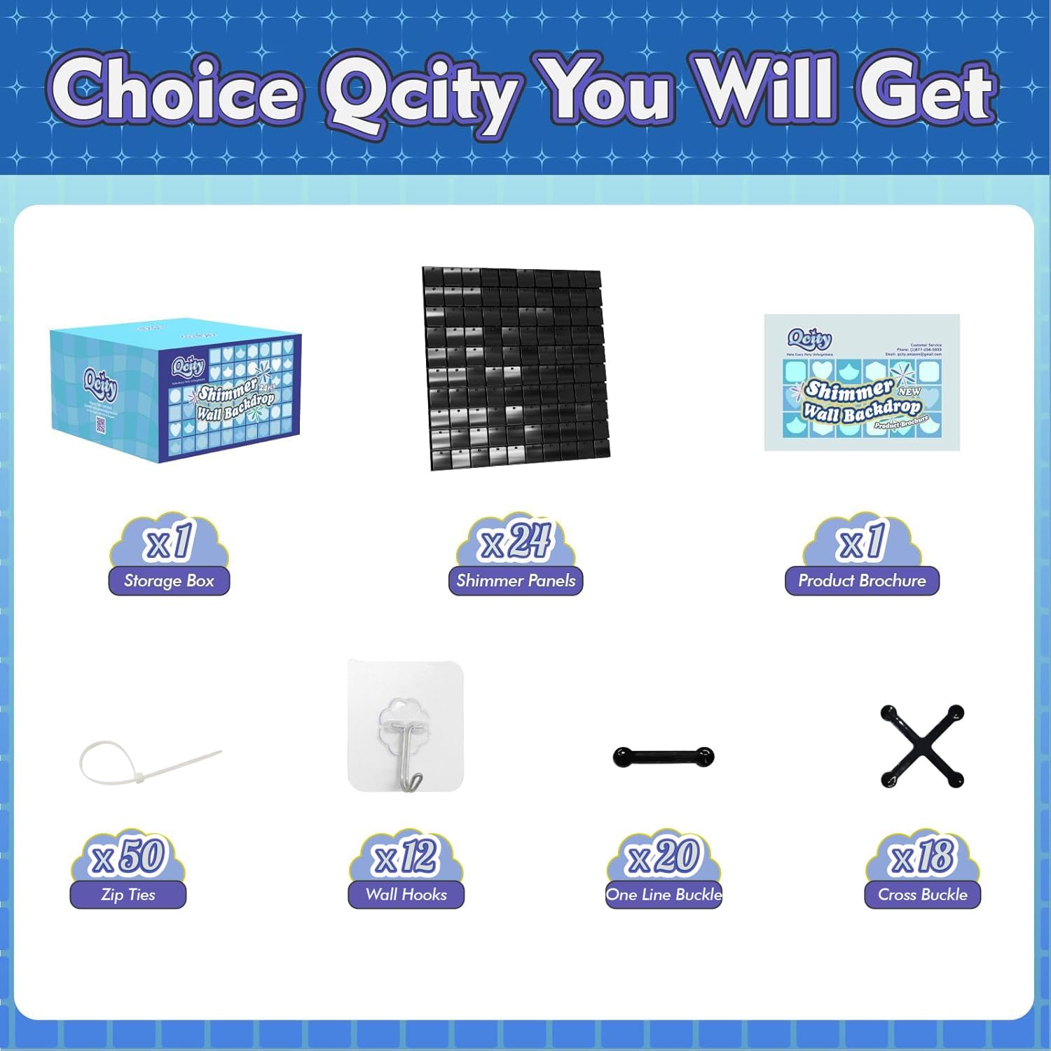 Qcity Black Shimmer Wall Backdrop 24PCS, Black Back Not See-Through Design, Square Sequin Glitter Backdrop Panel, Perfect for Outdoor Events, Birthdays, Wedding and Party Decoration