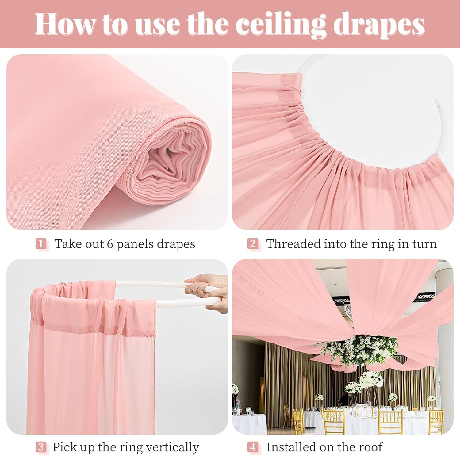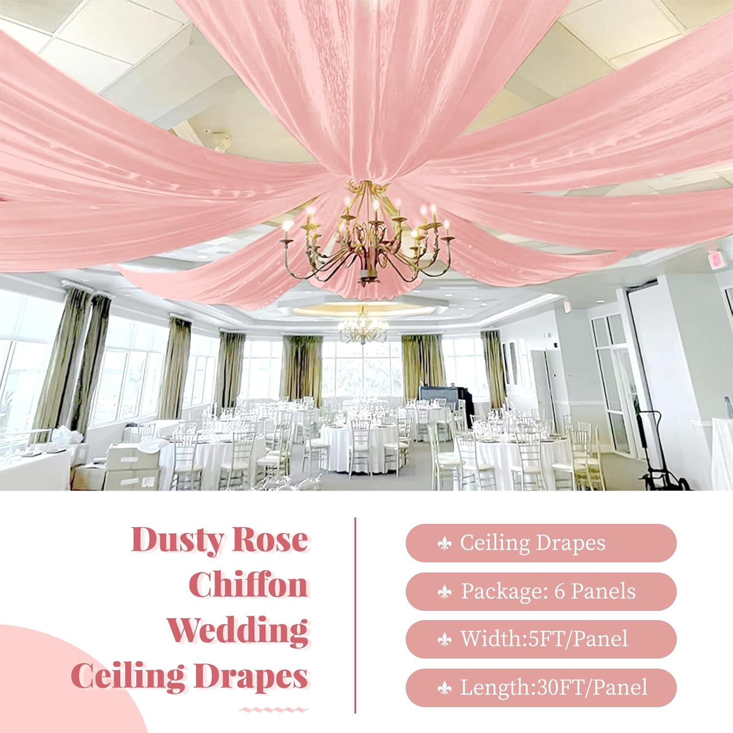 - 🌺Chiffon Ceiling Drapes: The package include 6 panels dusty rose wedding ceiling drapes (without hanging pieces). Each wedding long curtain measure for 5 feet width x 30 feet length. The sufficient quantity can meet your demands for decorating your weddings, parties, receptions. It will help to create a delicate and aesthetic sense to your wedding ceiling decoration.
