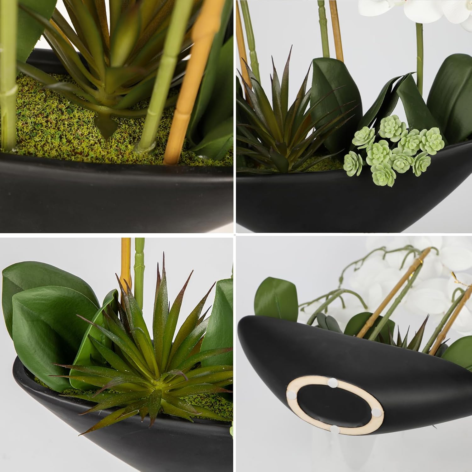 - Lifelike Appearance: Nestled in a stylish boat-shaped black ceramic pot, this carefully curated orchid flower ensemble boasts delicate blooms that captivate the eye and infuse your surroundings with serenity. The natural-looking orchid petals and leaves and the surrounding decorative artificial plants give the orchid arrangement a more realistic appearance.