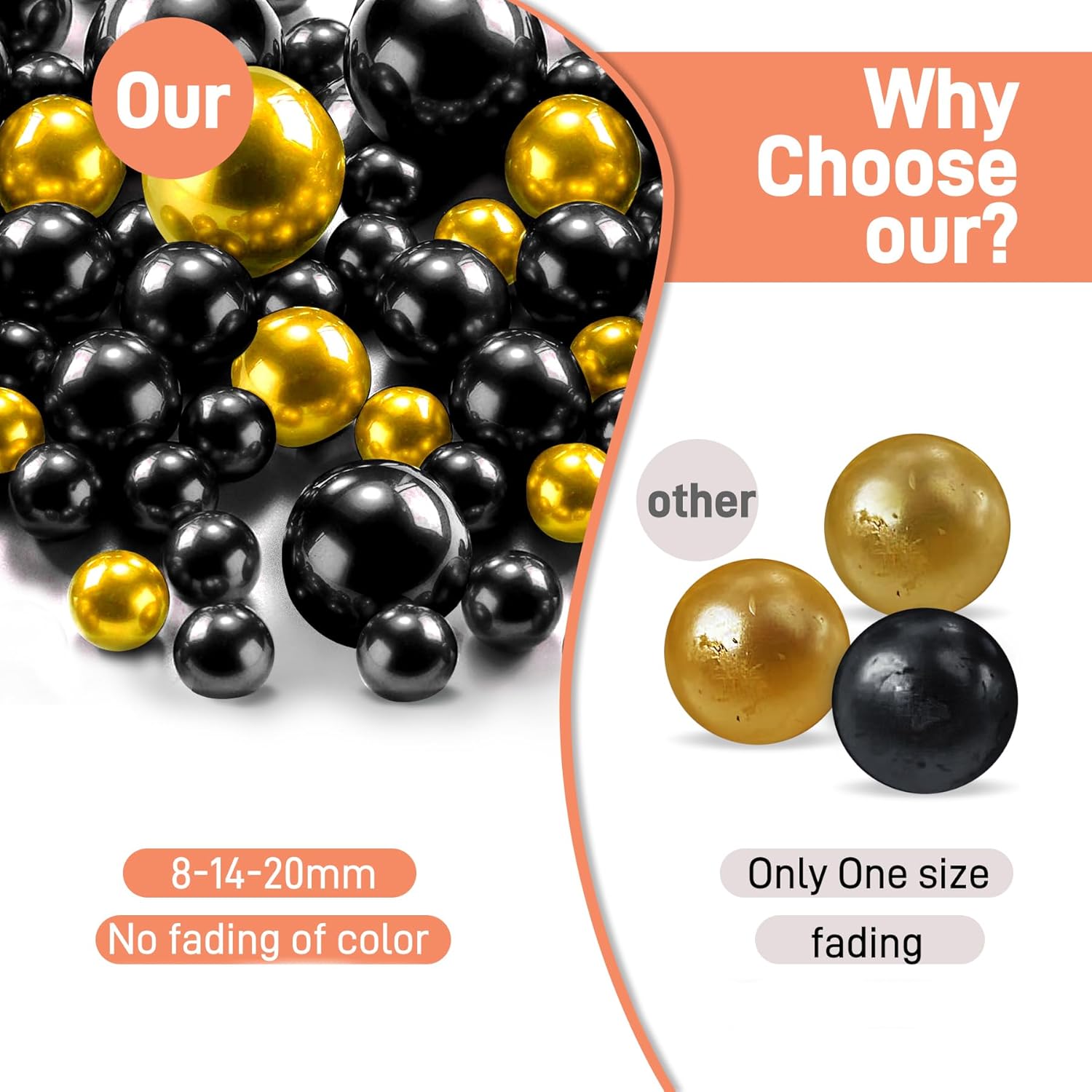 300Pcs Black&Gold Polished No Hole Faux Pearl Beads for Vase Filling Decorations, Plastic Pearls Vase Fillers, Table Scatters, Wedding Centerpiece, Home Decor, 8/14/20 mm