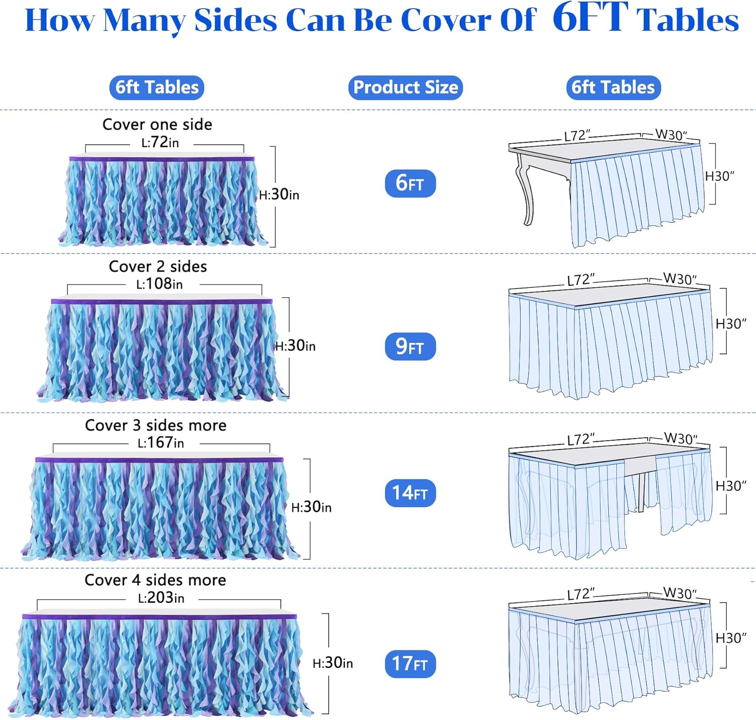 - Easy Set Up: Mermaid Ruffle tulle tutu table skirt design with wide double satin top trim finish and table skirt sewn with loop under the top edge,the package include hook with back adhesive. Stick the hook on the table and put the table skirt top edge right on the hook, the hook and loop stick together, done.