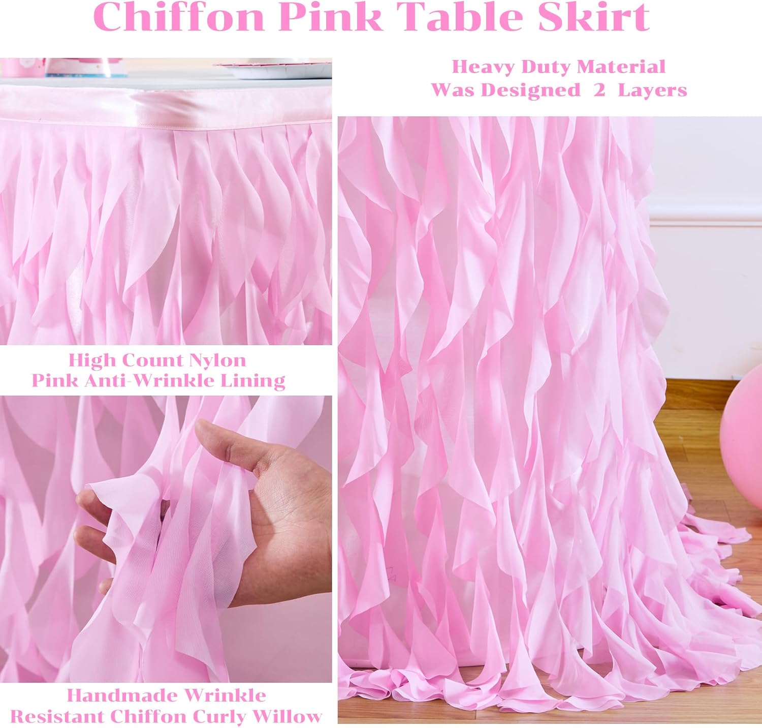 - Tutu Tulle Chiffon Fabric: Pink curly willow table skirt made with real fabric,heavy duty material was designed 2 layers, one is high count nylon blue anti-wrinkle lining,other one is hand made mix color chiffon curly willow,Definitely reusable, washable, and looked beautifully.
