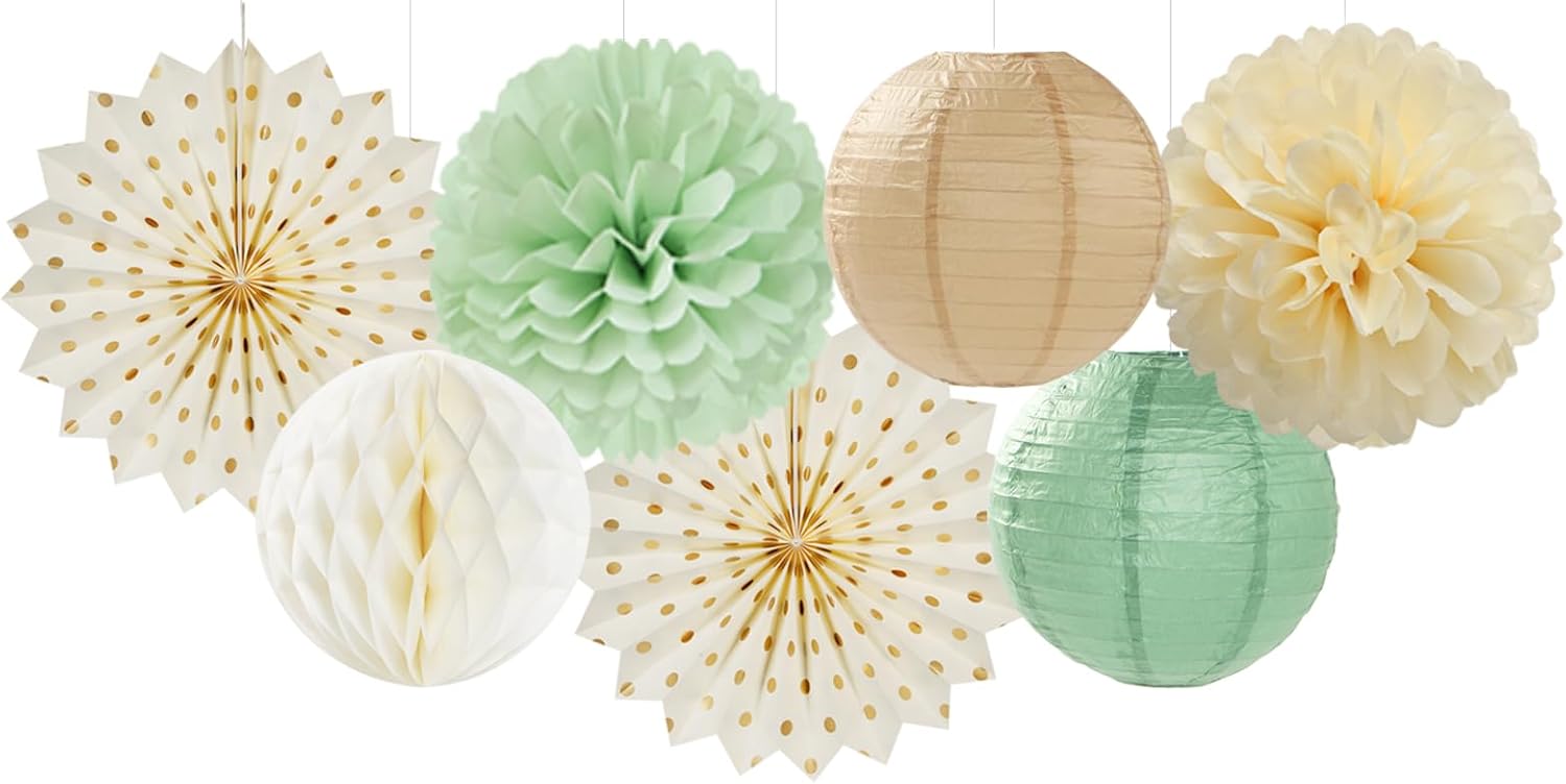 Sage-Green Beige-Champagne Party-Decorations Streamers Lanterns - 14pcs Neutral Baby Shower Paper Fan,Tissue Pom Poms,Honeycomb Balls,Boho Birthday Wedding Bachelorette Engagement Bridal Decor Ouruola
