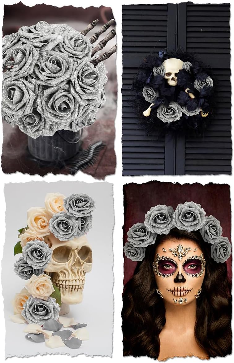 N&T NIETING Artificial Flowers Glowing Silver Flowers Foam 50pcs Glitter Roses Real Looking Fake Roses with Stem for DIY Wedding Bouquets Centerpieces Bridal Shower Party Home Decorations