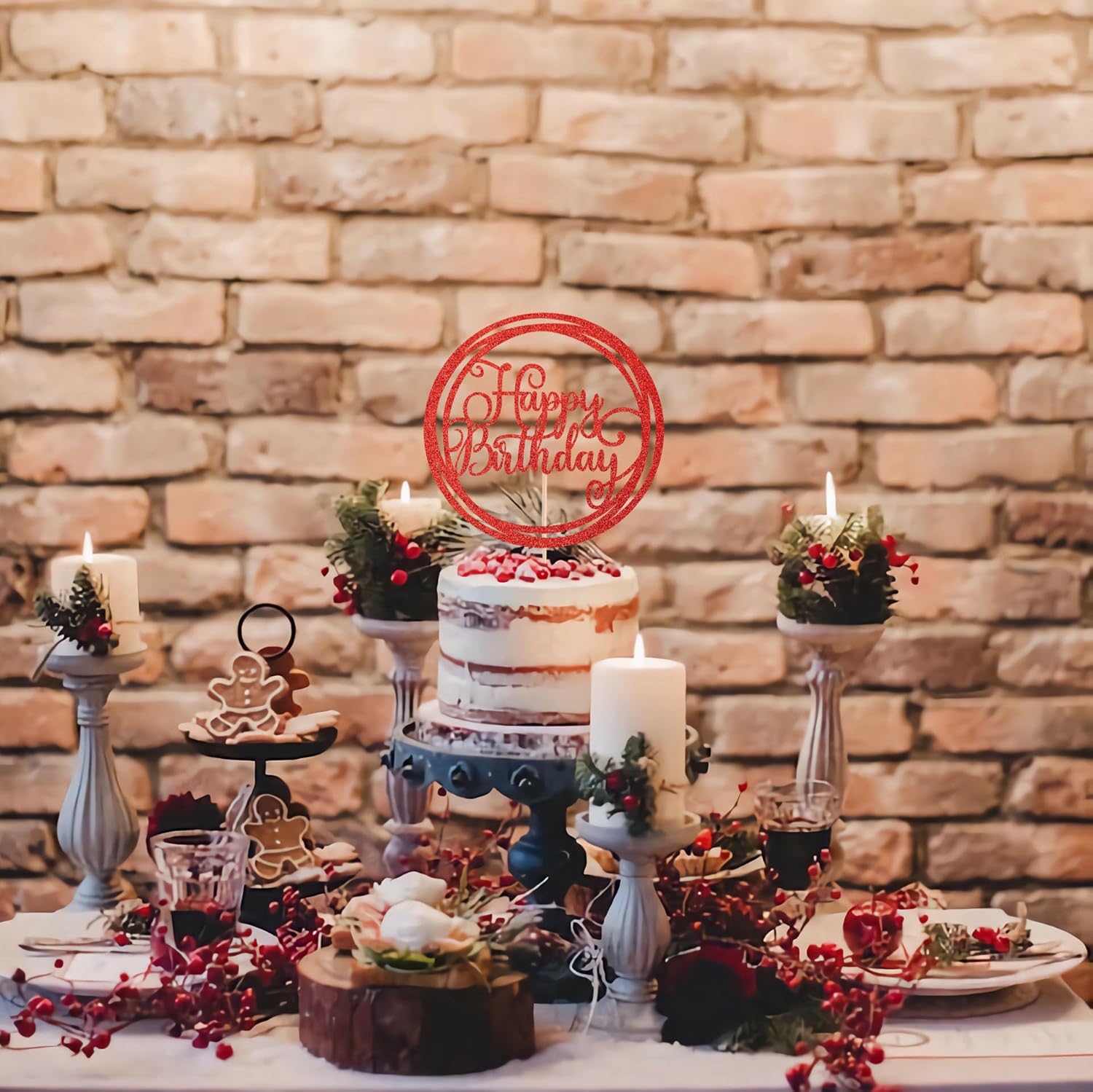Happy Birthday Cake Topper - Red Glitter Happy Birthday Cake Decoration Supplies for Children or Adults - Happy Birthday Cake Bunting Decor, Photo Booth Props