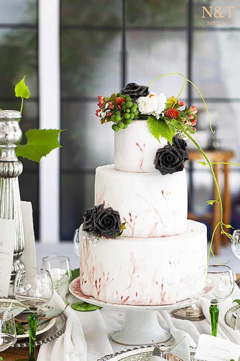 N&T NIETING Artificial Flowers Glowing Black Flowers Foam 50pcs Glitter Roses Real Looking Fake Roses with Stem for DIY Wedding Bouquets Centerpieces Bridal Shower Party Home Decorations