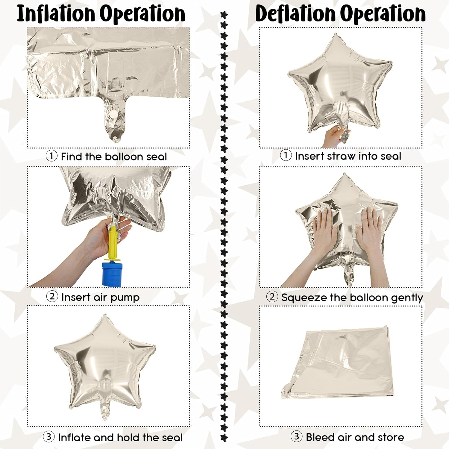 - Easy to Set Up: The stars foil balloons can inflate with helium or air. It is recommended to inflate to 90% to prevent the balloon from bursting