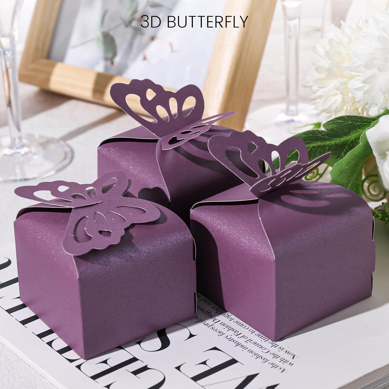- Package Includes - 50PCS purple butterfly favor boxes. Size is approx 2.4" x 2.4" x 1.8", height is not including the butterfly.