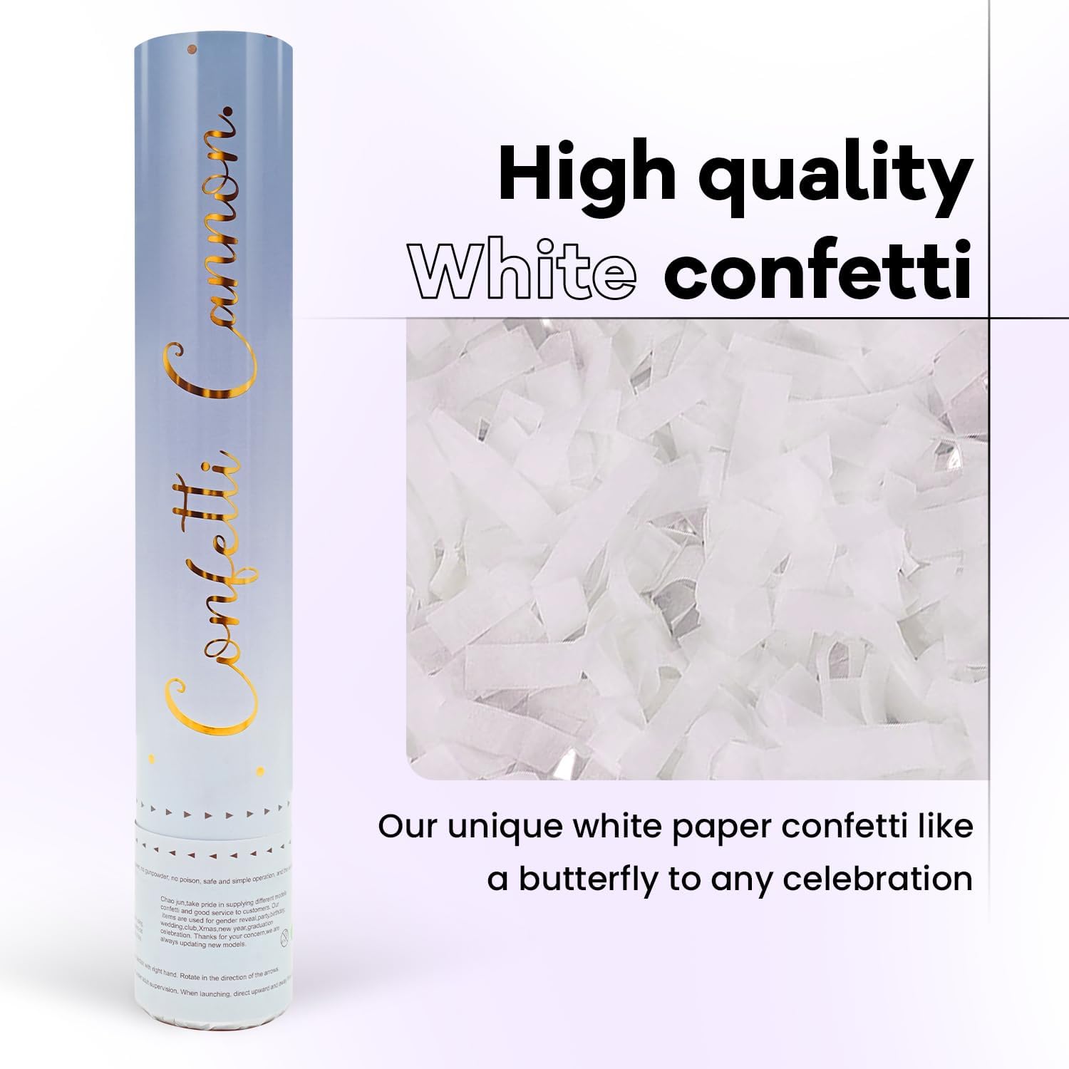 - Party Popper Cannon - Our confetti cannon for wedding white are designed for both indoor and outdoor use. Each white confetti cannon is 12 Inch and shoot 10-15 feet in the air. White party poppers works well and bring excitement to your celebration!