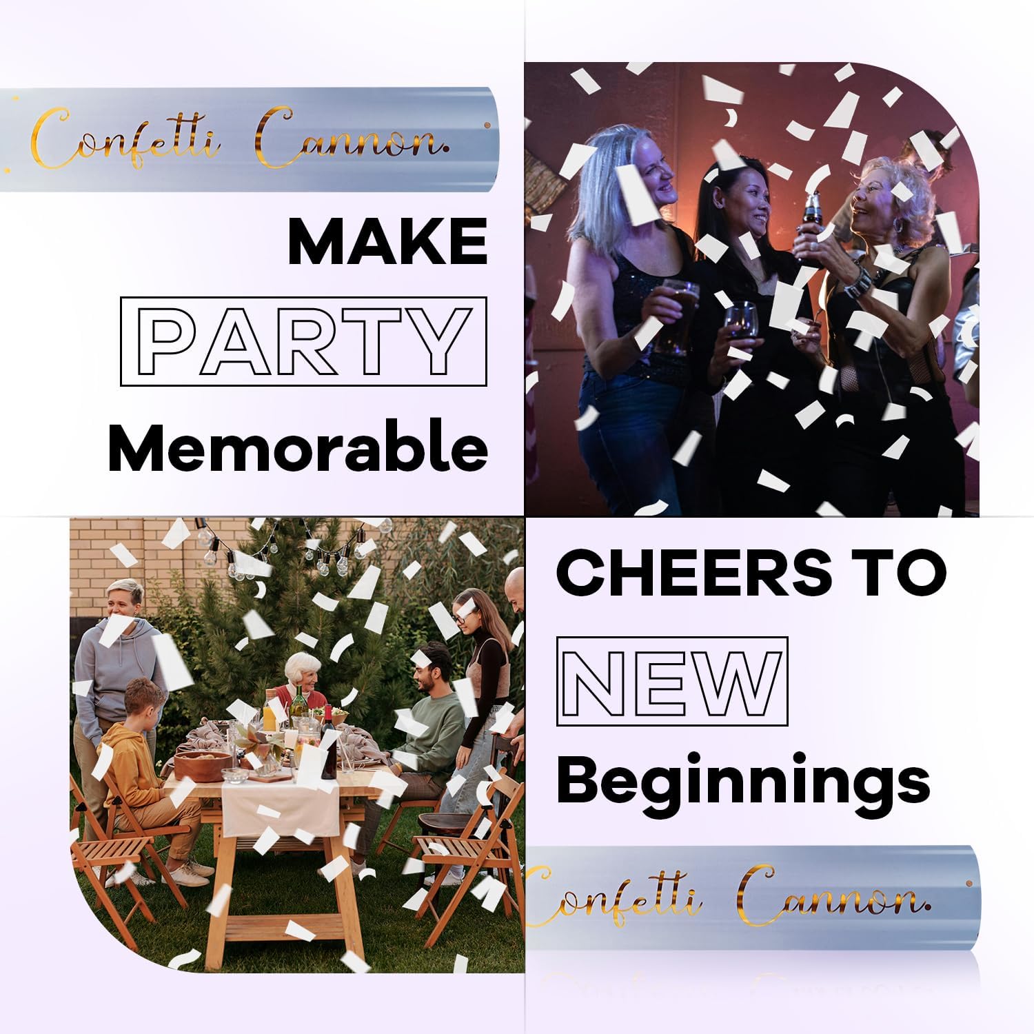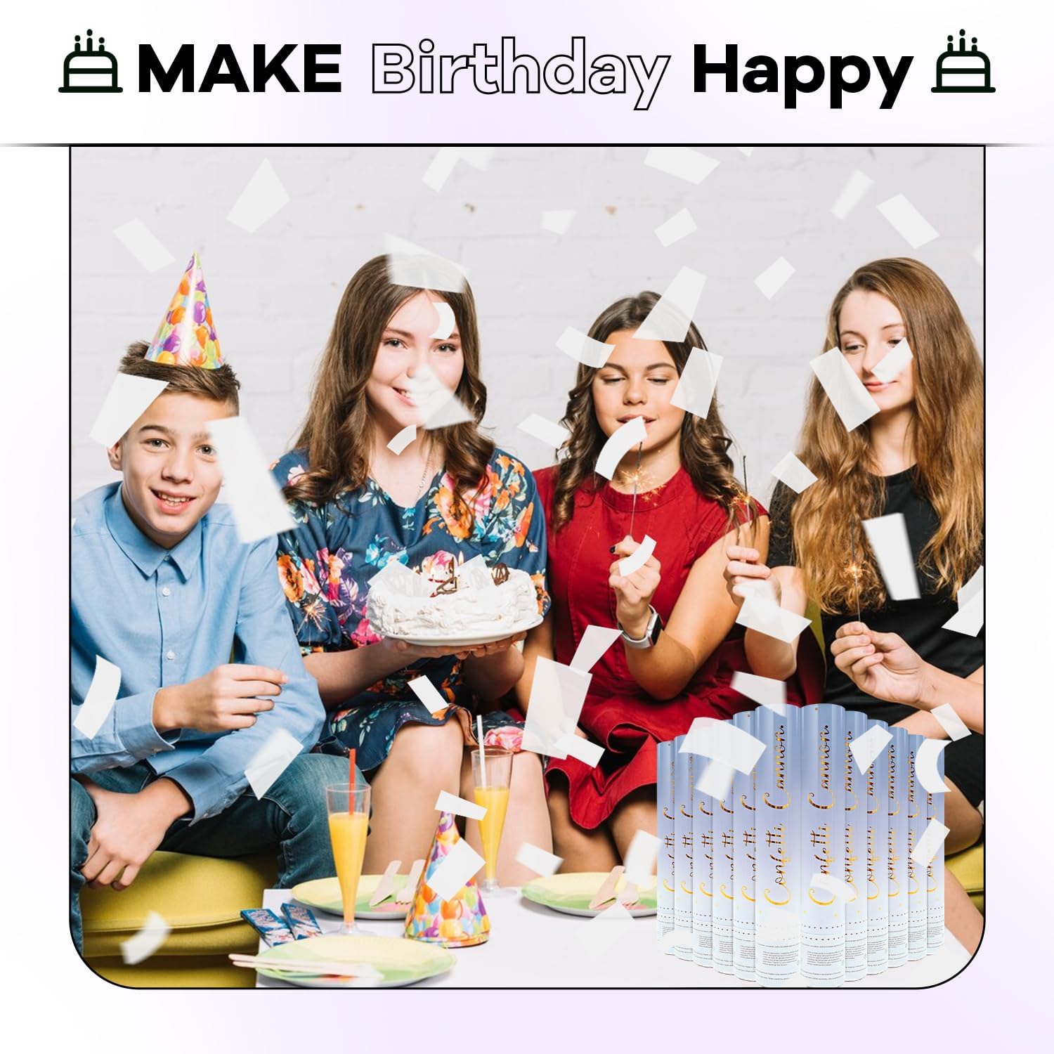 - Party Poppers with White Confetti - Our confetti poppers 12 inch are made of high quality confetti, ensuring a celebartion that's both fun and safe. confetti popper cannons are for any occasion, form weddings and engagements to birthdays and anniversaries, graduation Christmas New Year party.