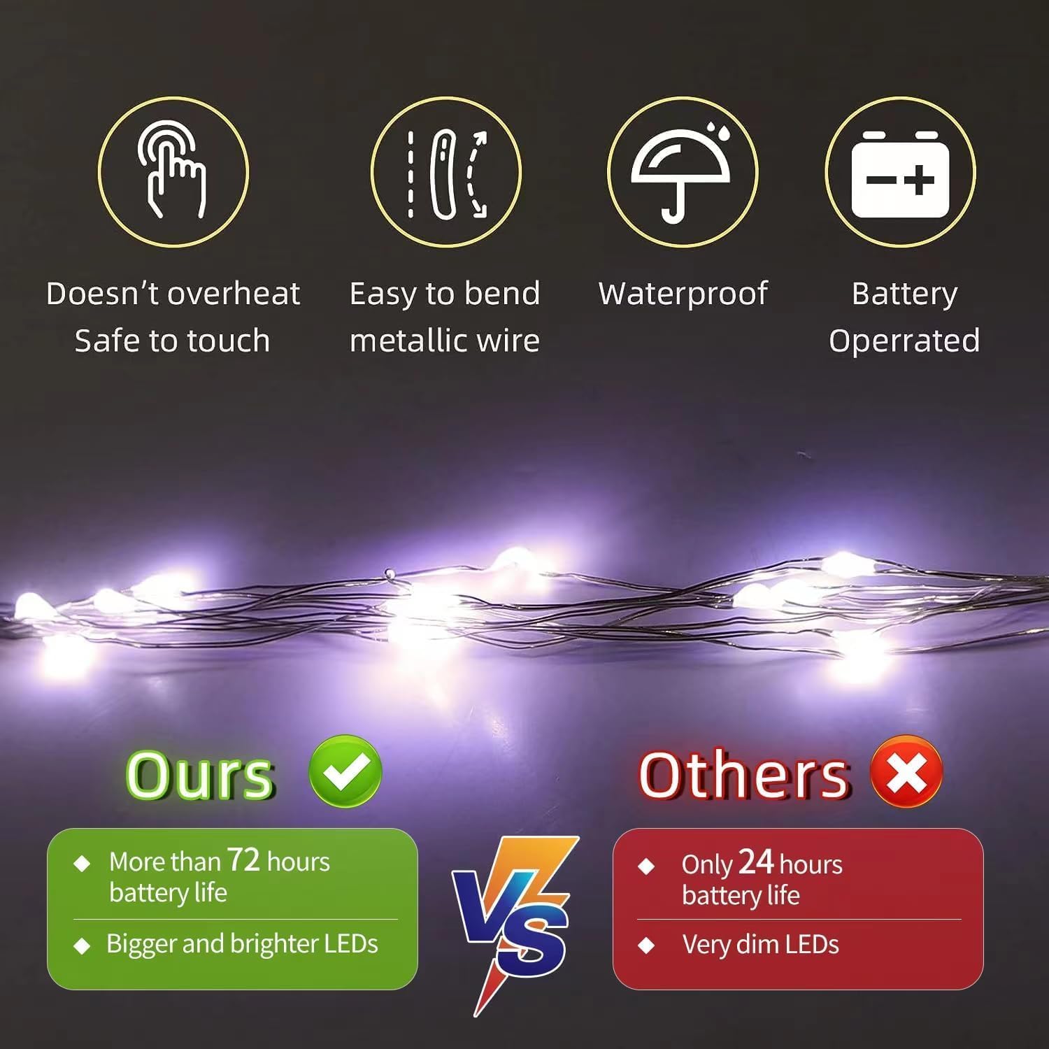 - DIY FAIRY WIRE LIGHTS: mini fairy lights by battery operated, bright and white fairy lights. Each fairy light has 20 small lights, can give you happy feelings like in a fairy tale world. Led fairy lights are made of 6.6 feet of high quality silver coated copper wire, which makes battery light string more stronger and durable.