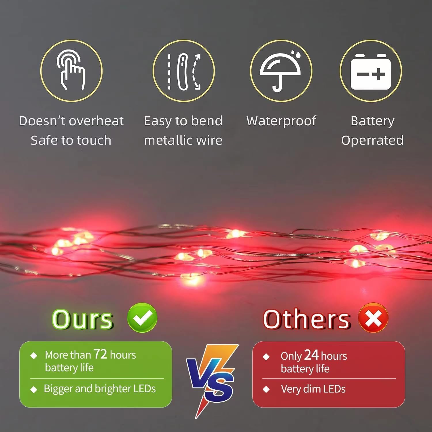 - DIY FAIRY WIRE LIGHTS: mini fairy lights by battery operated, bright and RED fairy lights. Each fairy light has 20 small lights, can give you happy feelings like in a fairy tale world. Led fairy lights are made of 6.6 feet of high quality silver coated copper wire, which makes battery light string more stronger and durable.