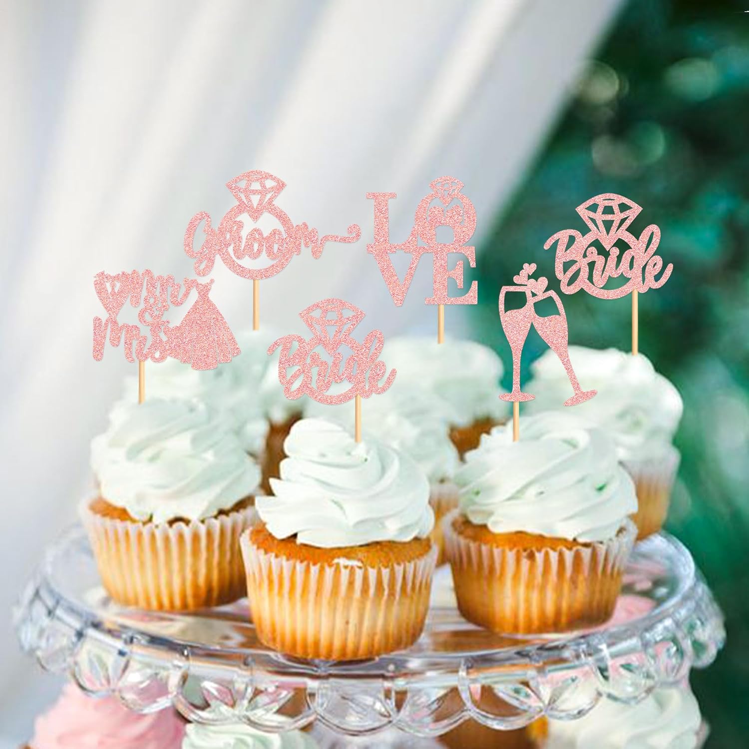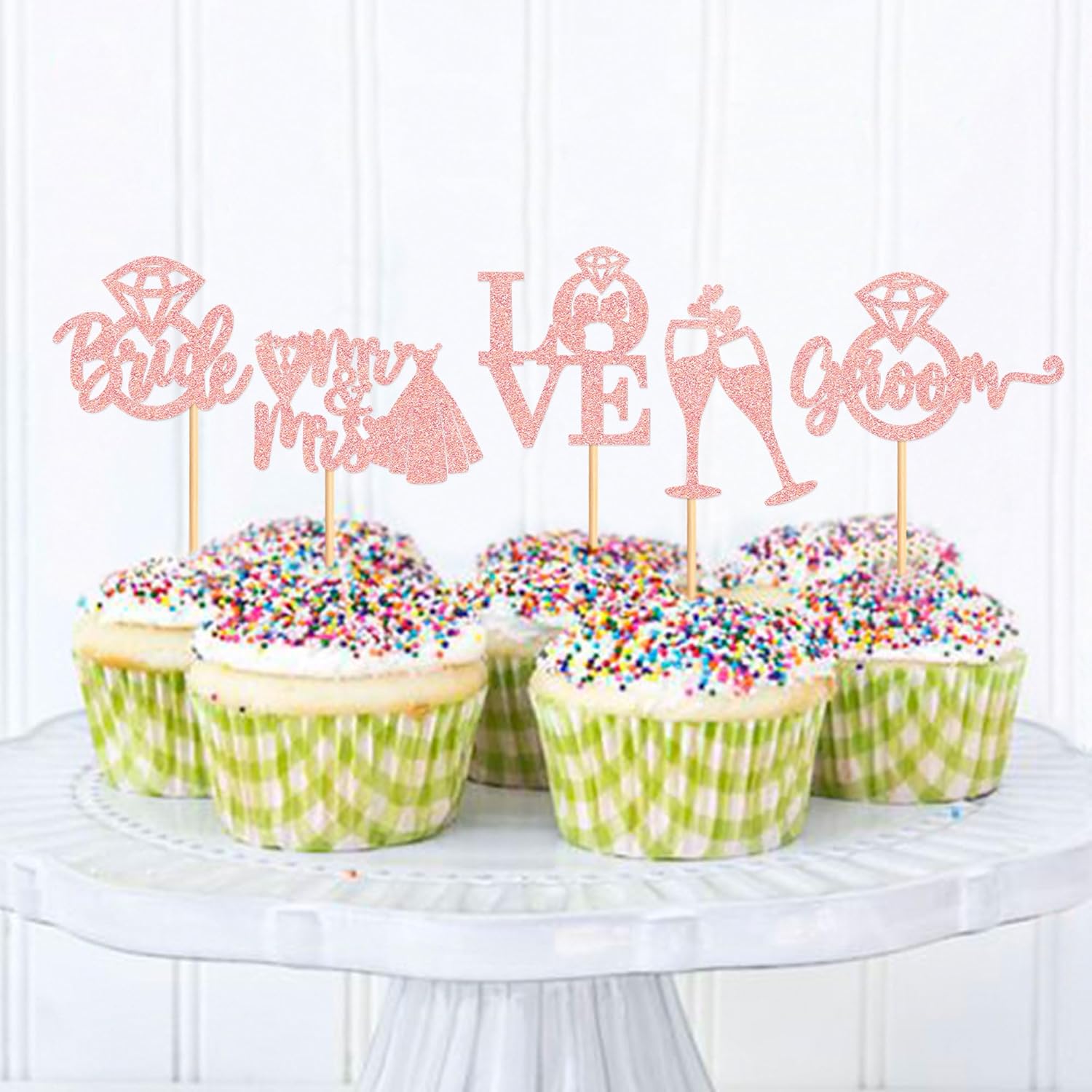 - š°ćUnique designćļ¼Sparkling adorable bride and groom cupcake toppers makes your cupcakes become the focus of bridal shower or wedding party. All cupcake toppers are pre-assembled, it can save much time for you.