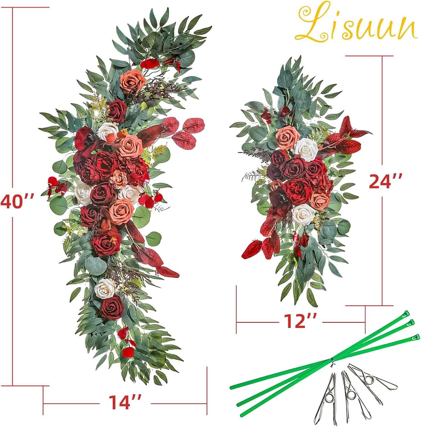 - Enlarged Size:The large flower swag design straightens measures 40" long x 14" wide(100*35cm), small flower tie measures 24" long x 12" wide(60*30cm),the larger size contains more flowers and decorations, let your wedding ceremony more colorful atmosphere.